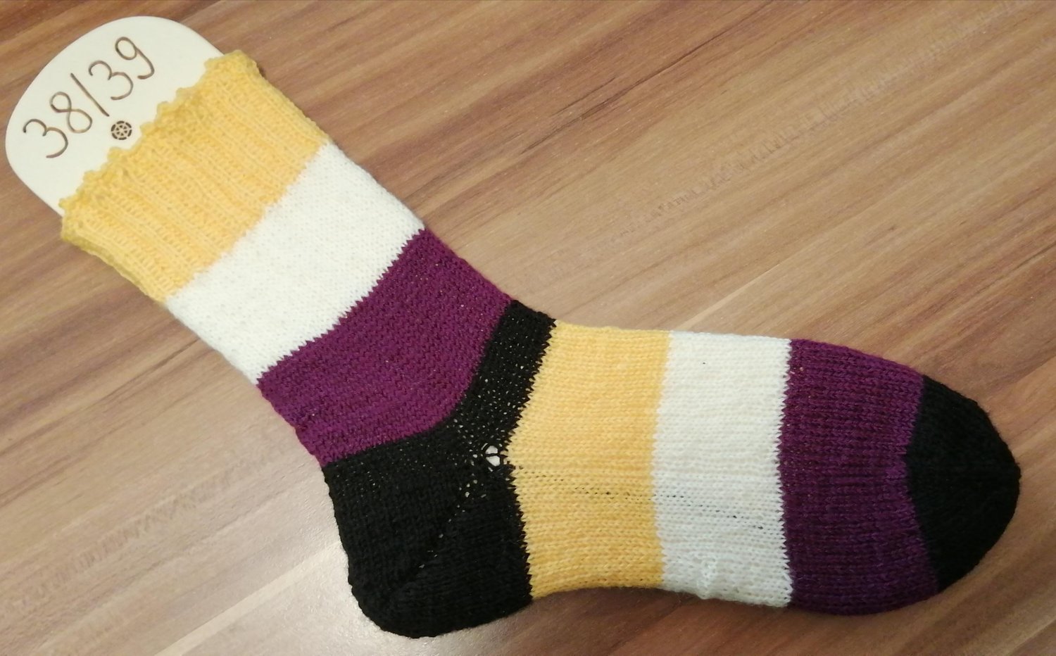 Handknitted socks in the nonbinary flag colors size EU 38/39. They come as a pair of course ;) Wool is Lang Yarns Jawoll Superwash