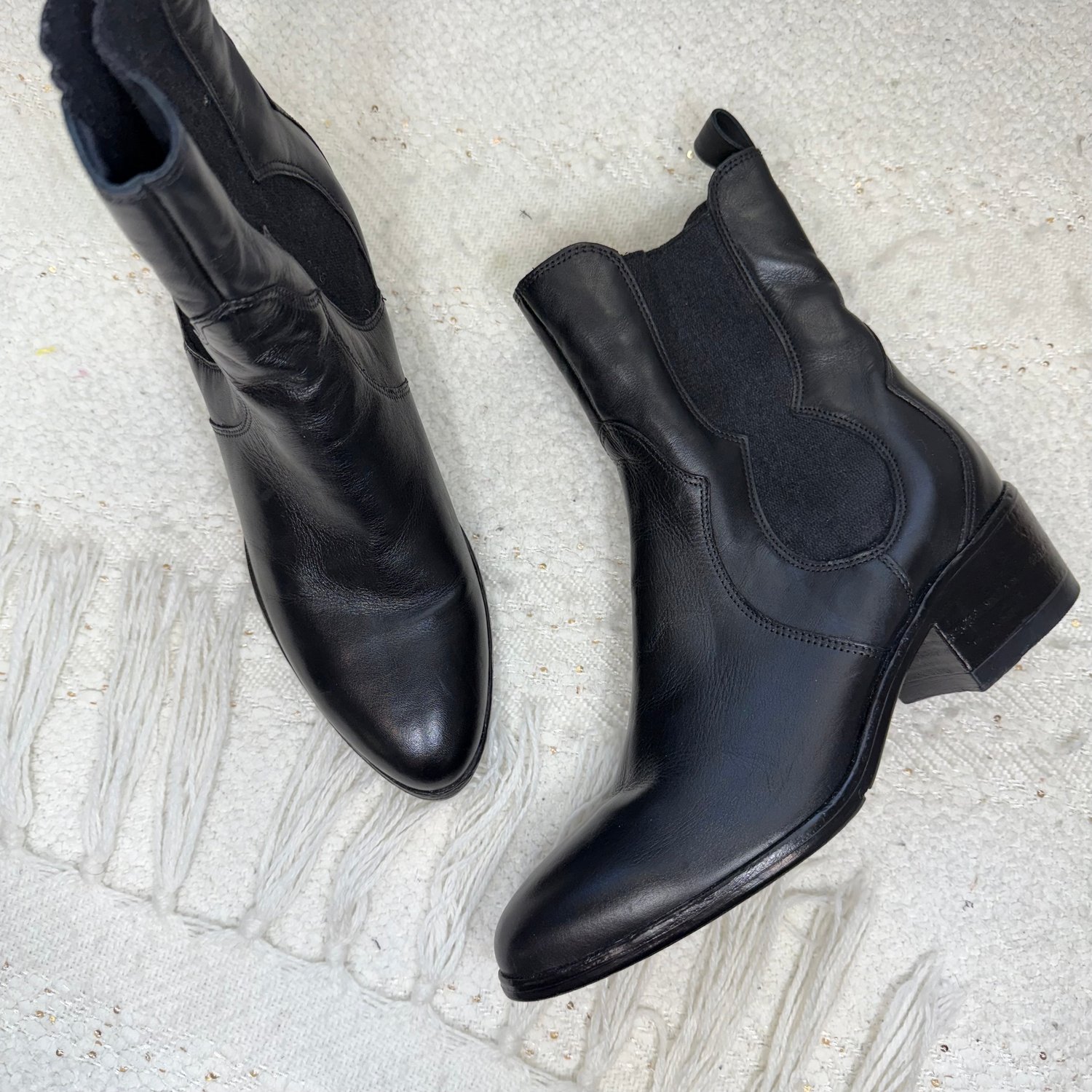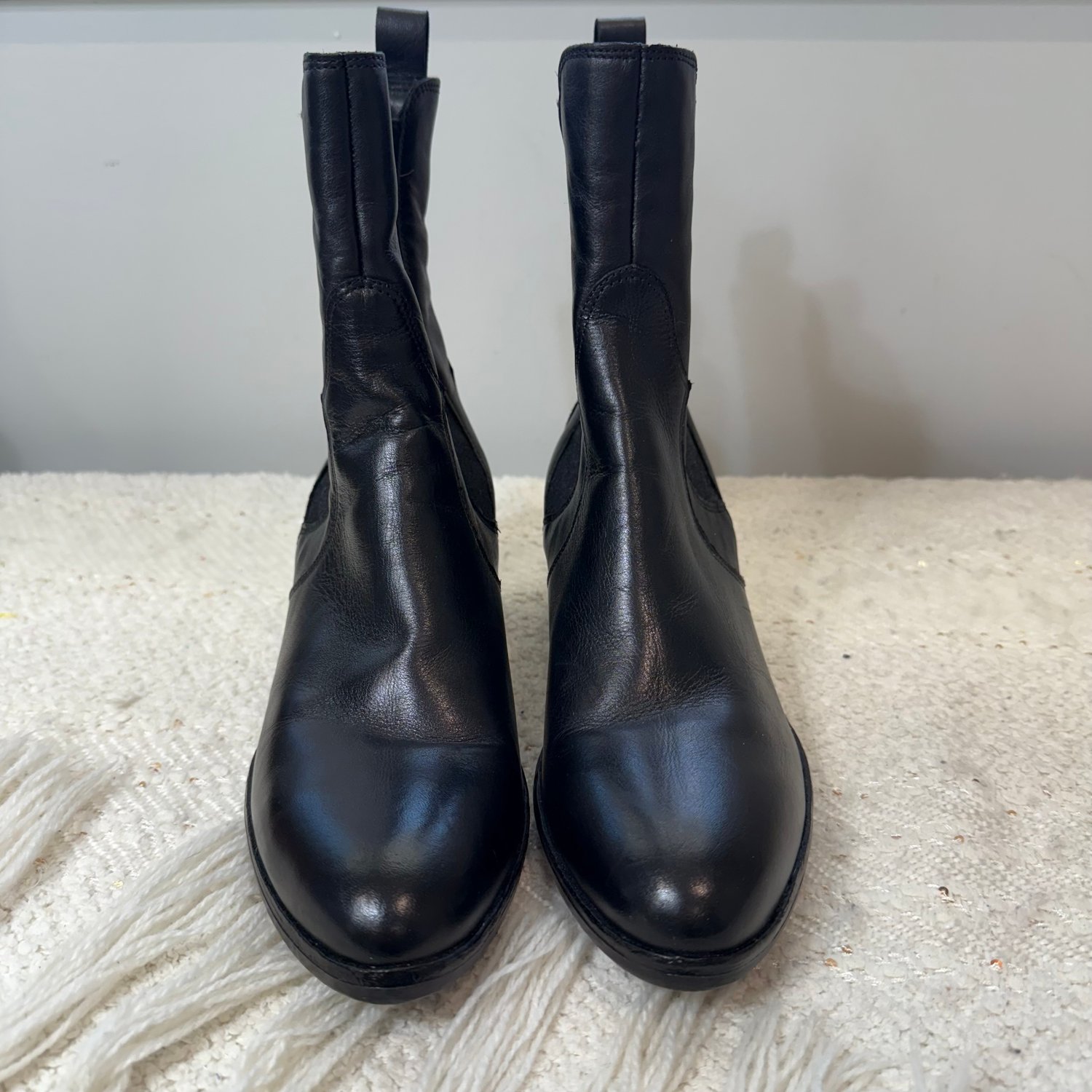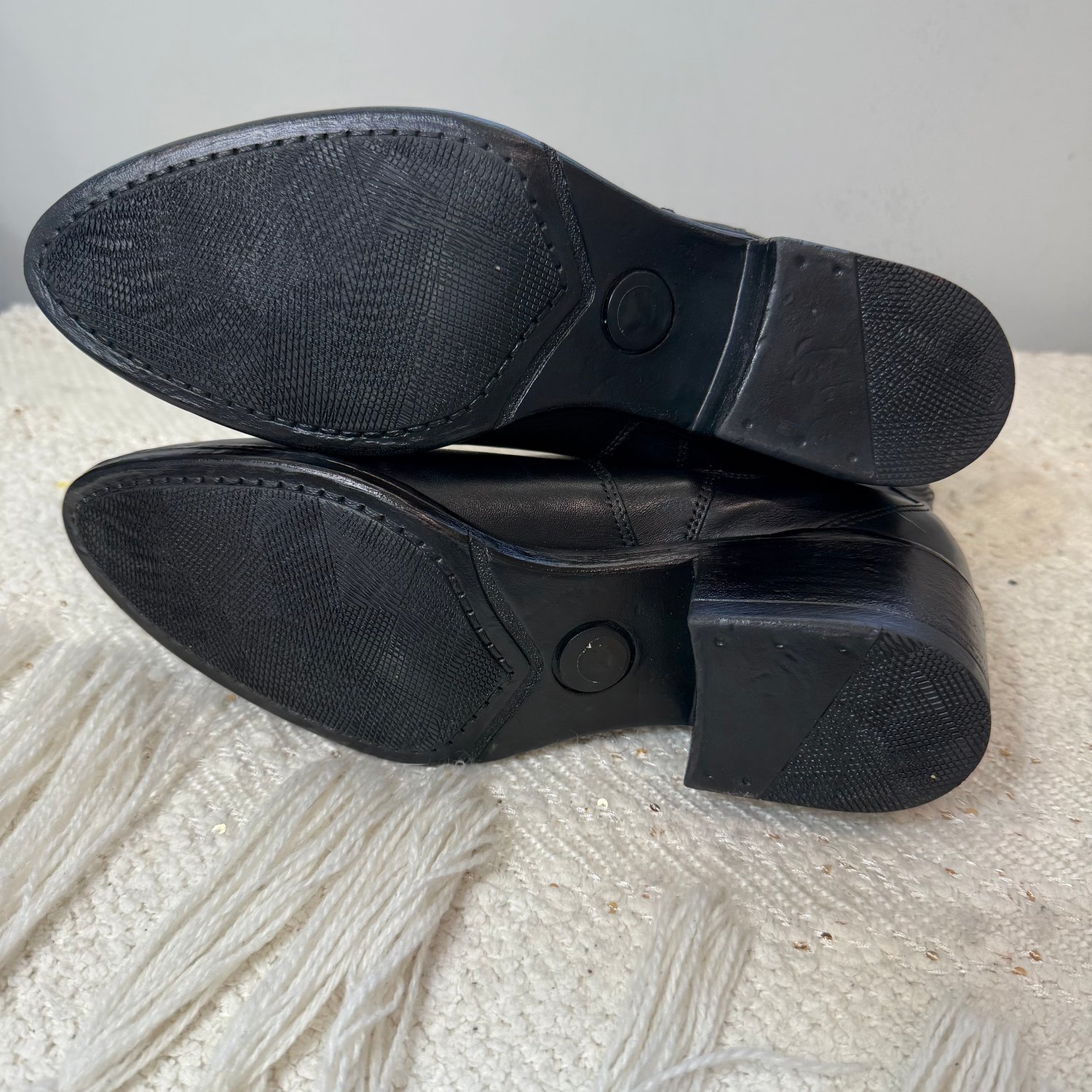 Coach and Four black leather pull on ankle boots with a slightly pointed toe and low block heel.