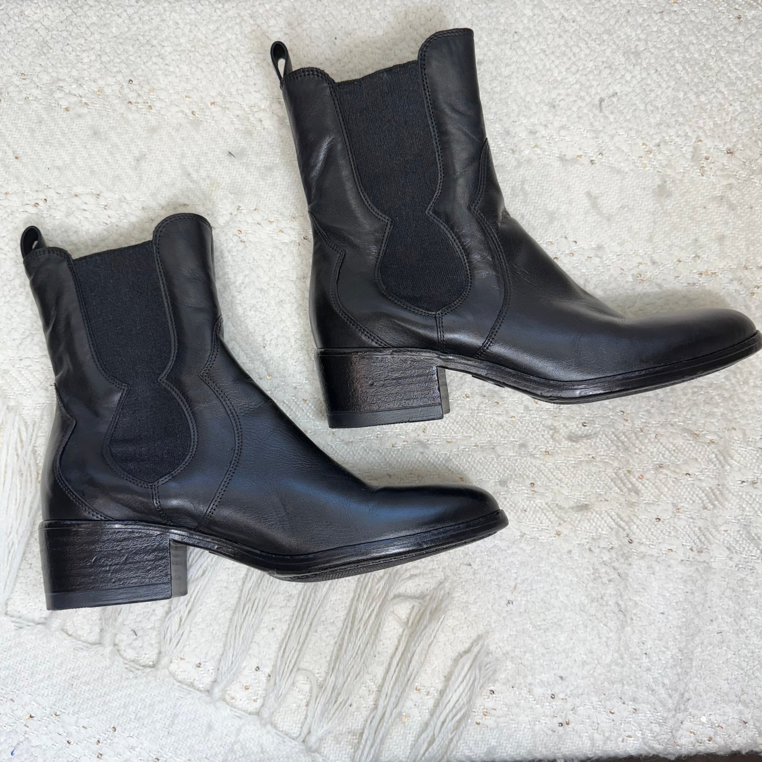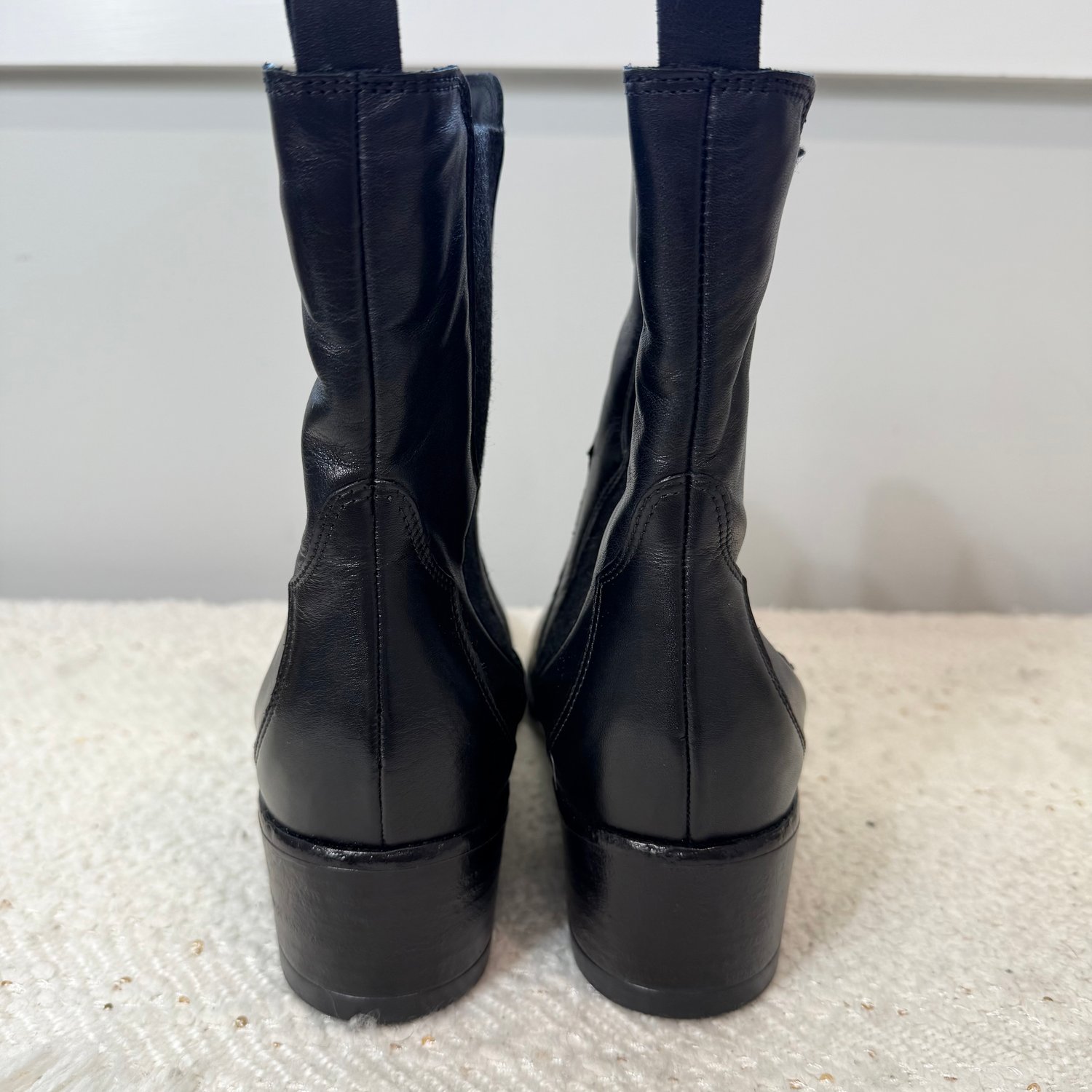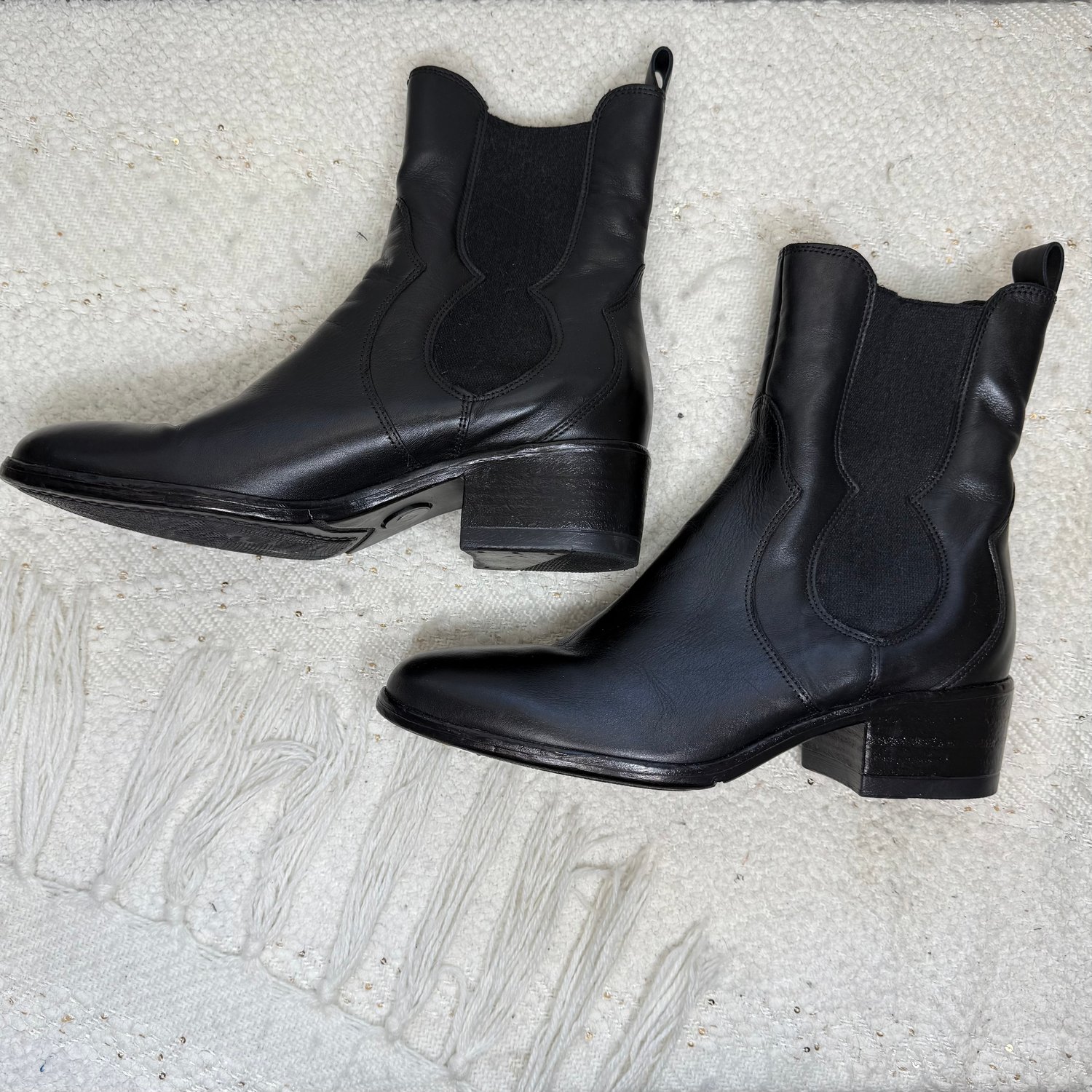 Coach and Four black leather pull on ankle boots with a slightly pointed toe and low block heel.