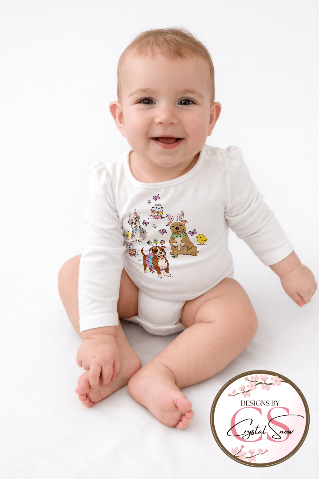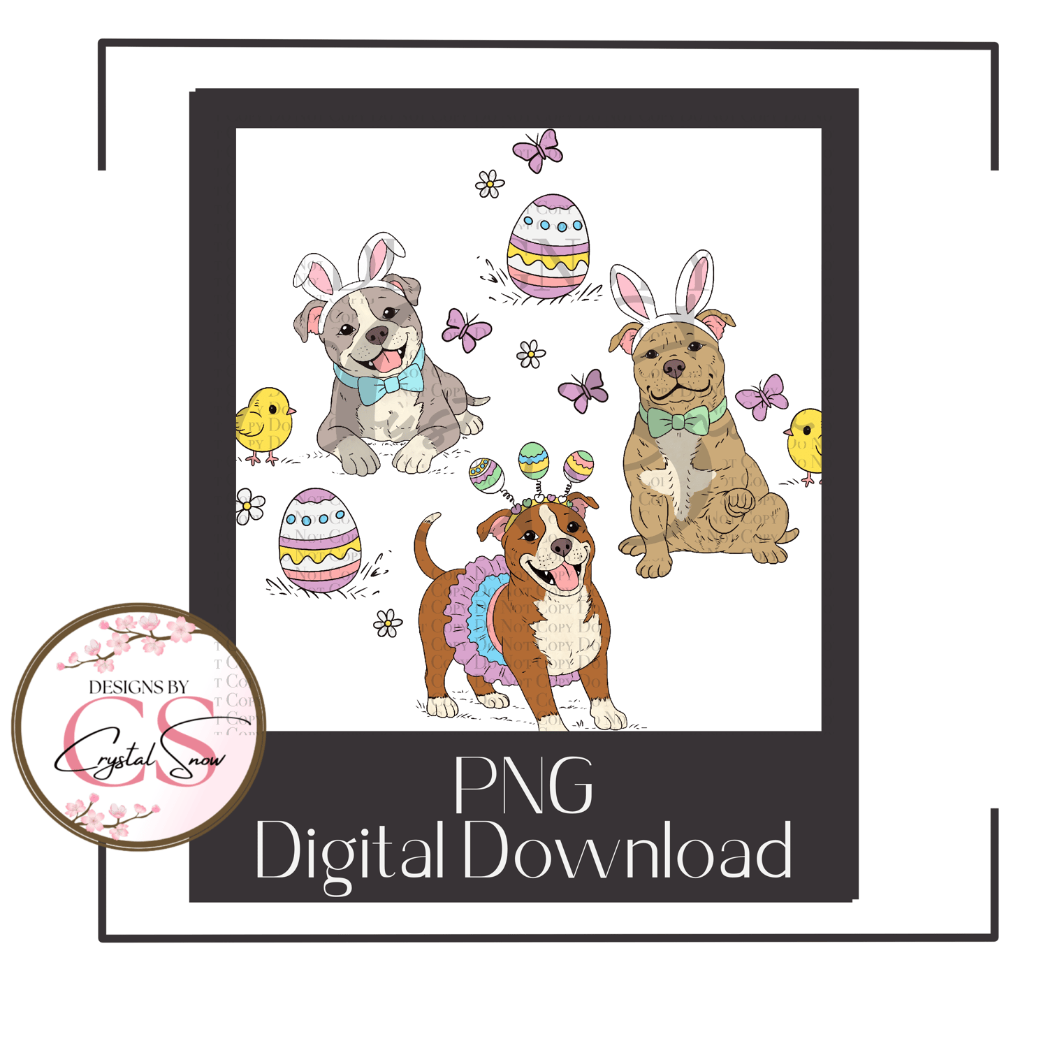 This listing includes a high-resolution PNG featuring Easter-themed pitbull characters with bunny ears, bows, and festive spring details.