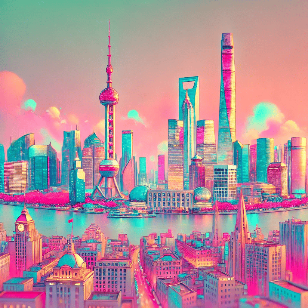 This vibrant, futuristic vision of Shanghai showcases the Pudong skyline, the Oriental Pearl Tower, and the Bund, all bathed in a dreamy, pastel-infused palette. The fusion of neon lights and soft artistic hues creates a surreal, cyberpunk-inspired atmosphere, making this piece a mesmerizing modern masterpiece.