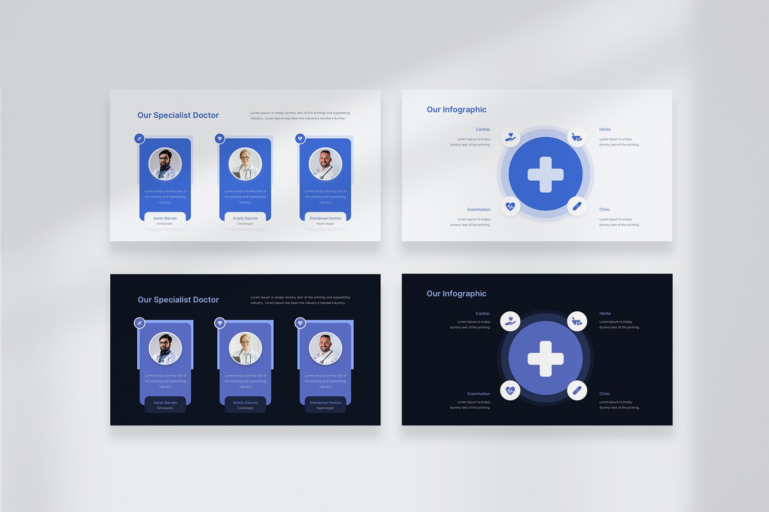 Built with a precise blue color system and dual Light–Dark modes, this template delivers clarity for data, reports, and clinical communication.