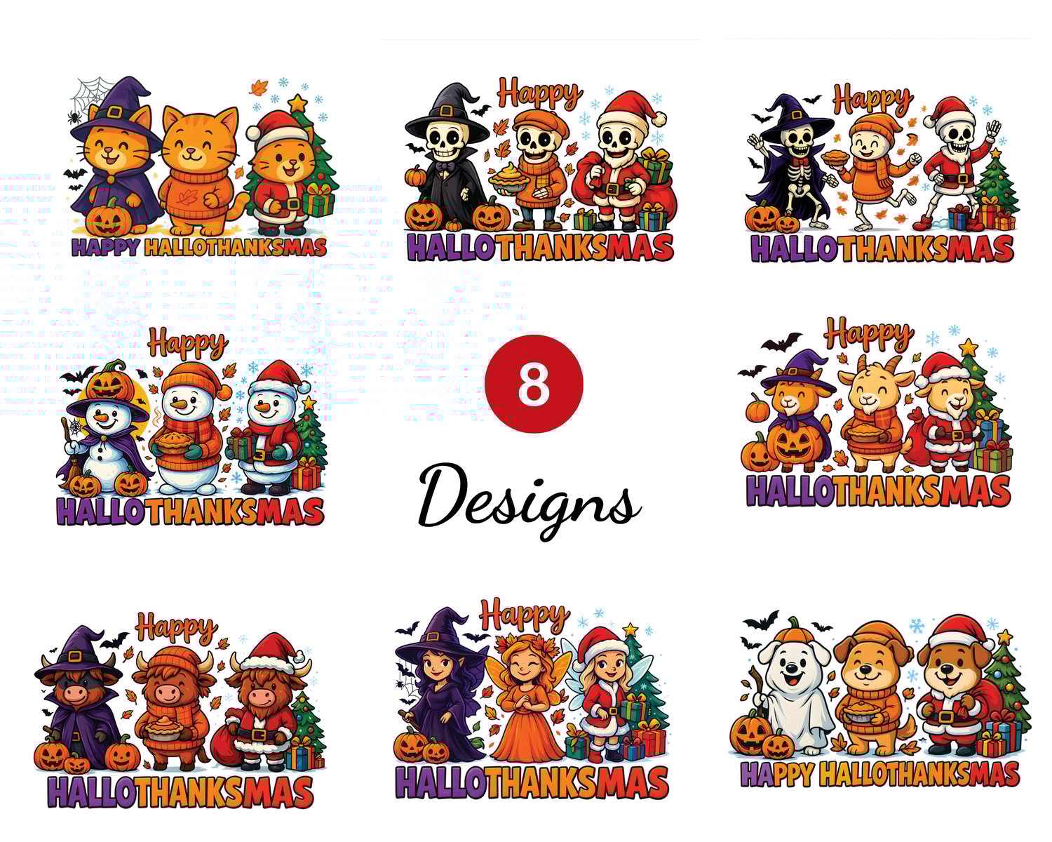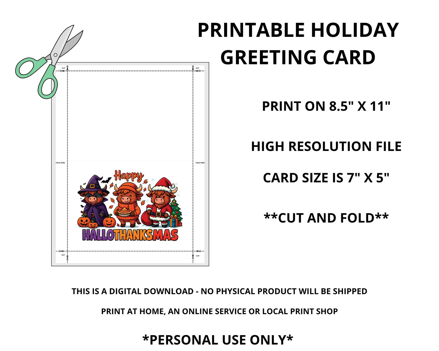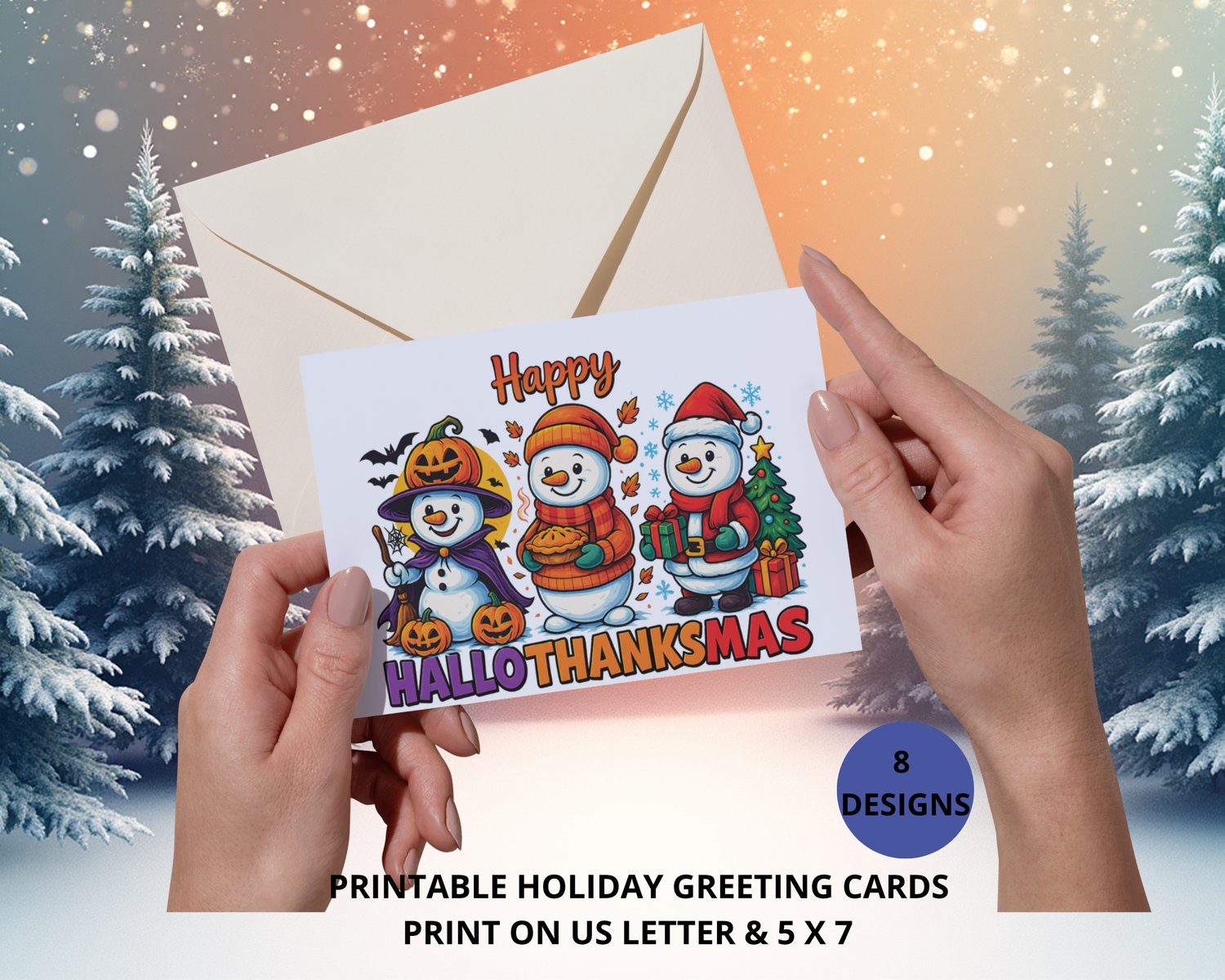 Celebrate HallowThanksMas (Halloween, Thanksgiving and Christmas) with this adorable set of 8 Printable Greeting Cards.