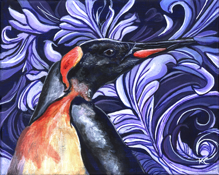 Purple Tuxedo invites the viewers to notice the quiet dignity in the penguin's posture and the refined details of its plumage--nature's own formal attire. The flowing, decorative lines of the purple background frame the subject with a sense of timeless sophistication, bridging the sense simplicity of wildlife with the artistry of human design. The work is both playful and reverent.