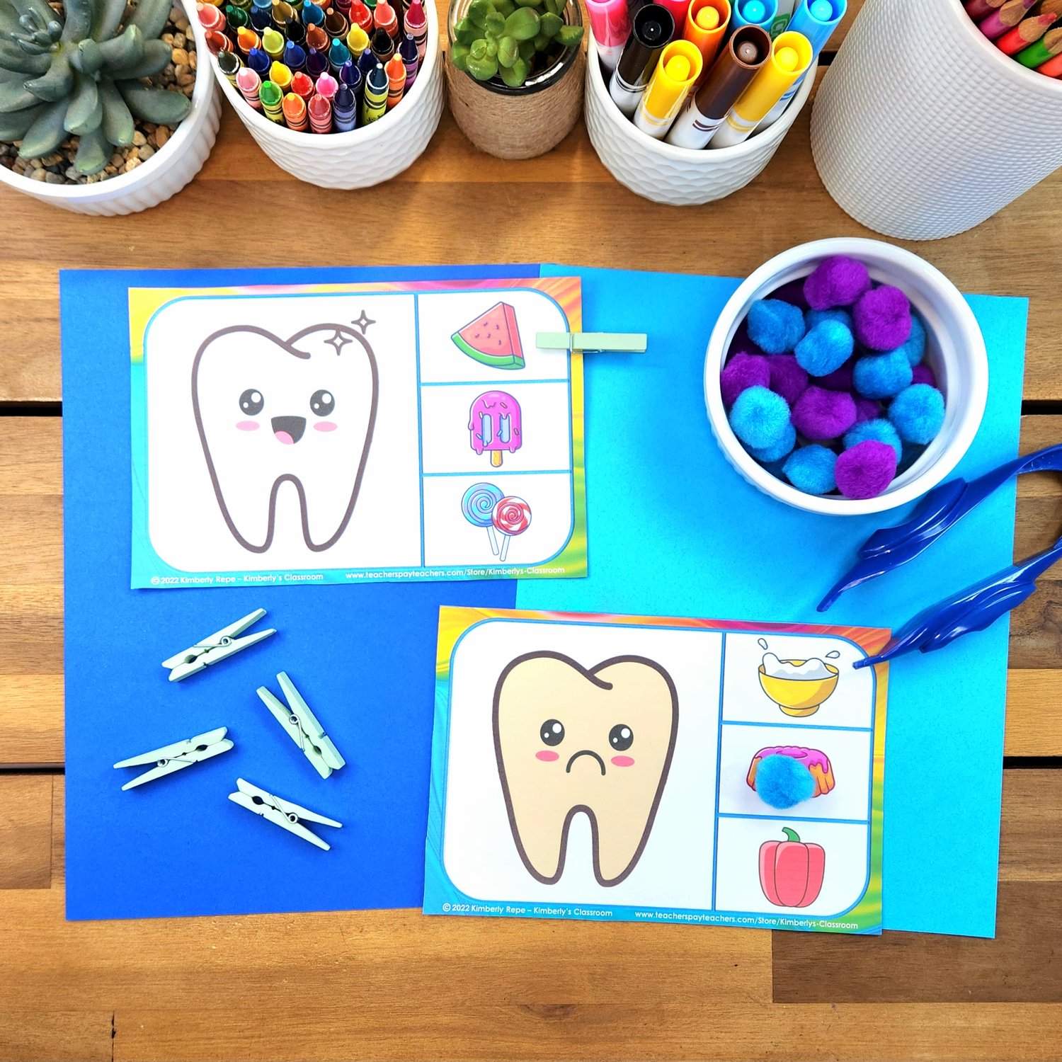 ✏️Use the task cards to practice identifying good vs. bad foods for our teeth. Students can use clothes pins or small manipulatives to show their answers.