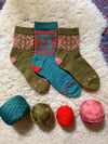 Samples are shown in Size 1 ankle-length (green and pink) using Green Letter Day Sock (473 yds [430m] / 100g; 75% SW Merino / 25% nylon) in Fairy Ring (yarn A) and All the Way Mae (yarn B) and Size 2 calf-length (blue and orange) using Green Letter Day Sock in Treasure Island (yarn A) and Little Lionhead Knits Fingering Weight (87 yds [80m] / 20g; 85% SW Merino / 15% nylon) in Let’s Picnic (yarn B).