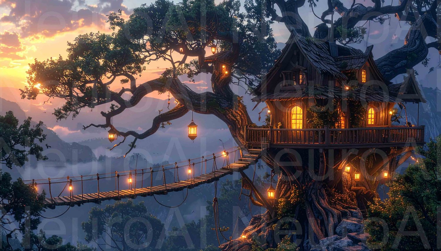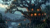 Magical treehouse fantasy landscape with cozy glowing lanterns