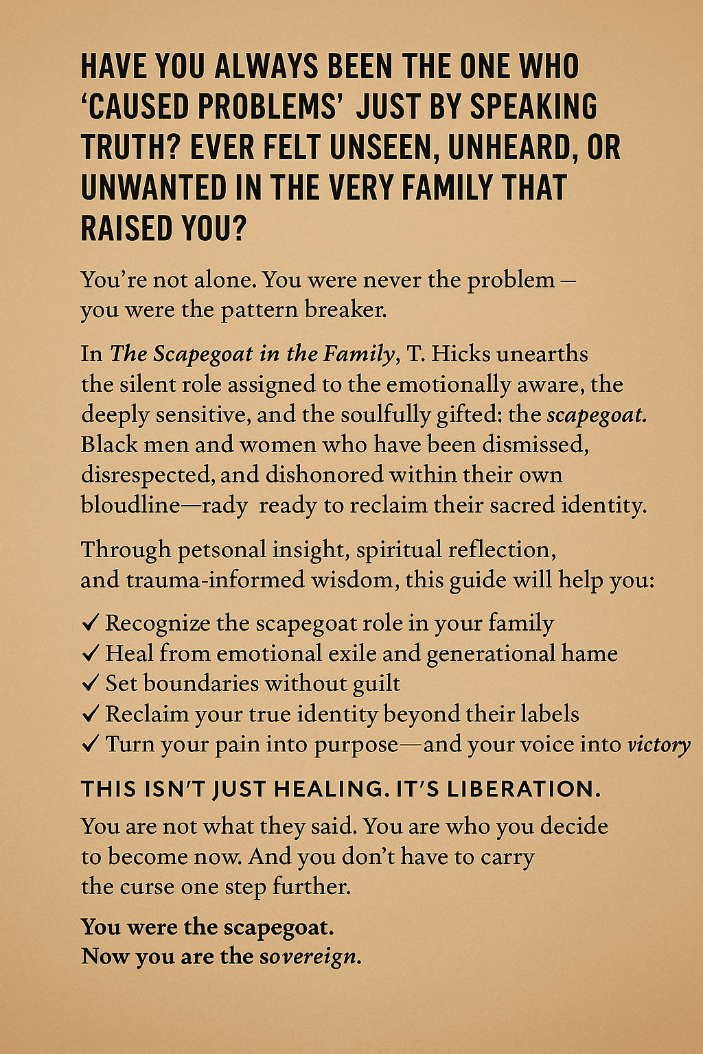 This soul-stirring eBook was written for emotionally aware, spiritually gifted Black men and women who were made to carry burdens that were never theirs. T. Hicks walks you step-by-step through the truth of scapegoating, the trauma it causes, and most importantly — the transformation that follows.