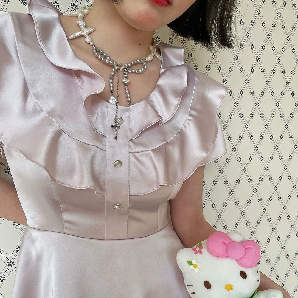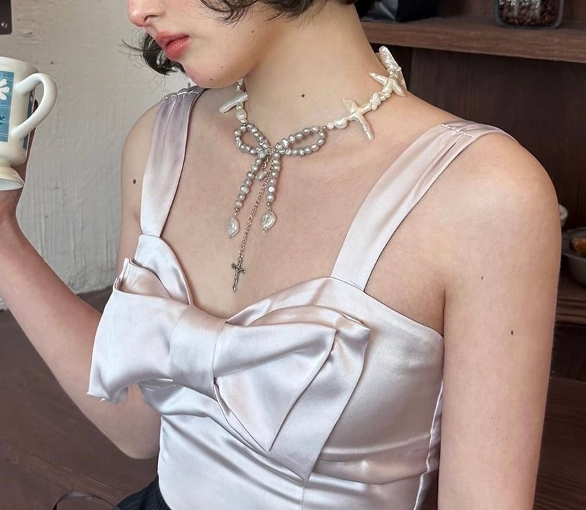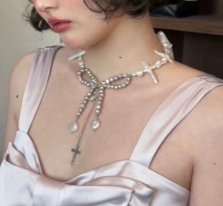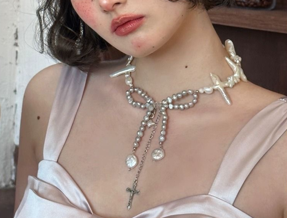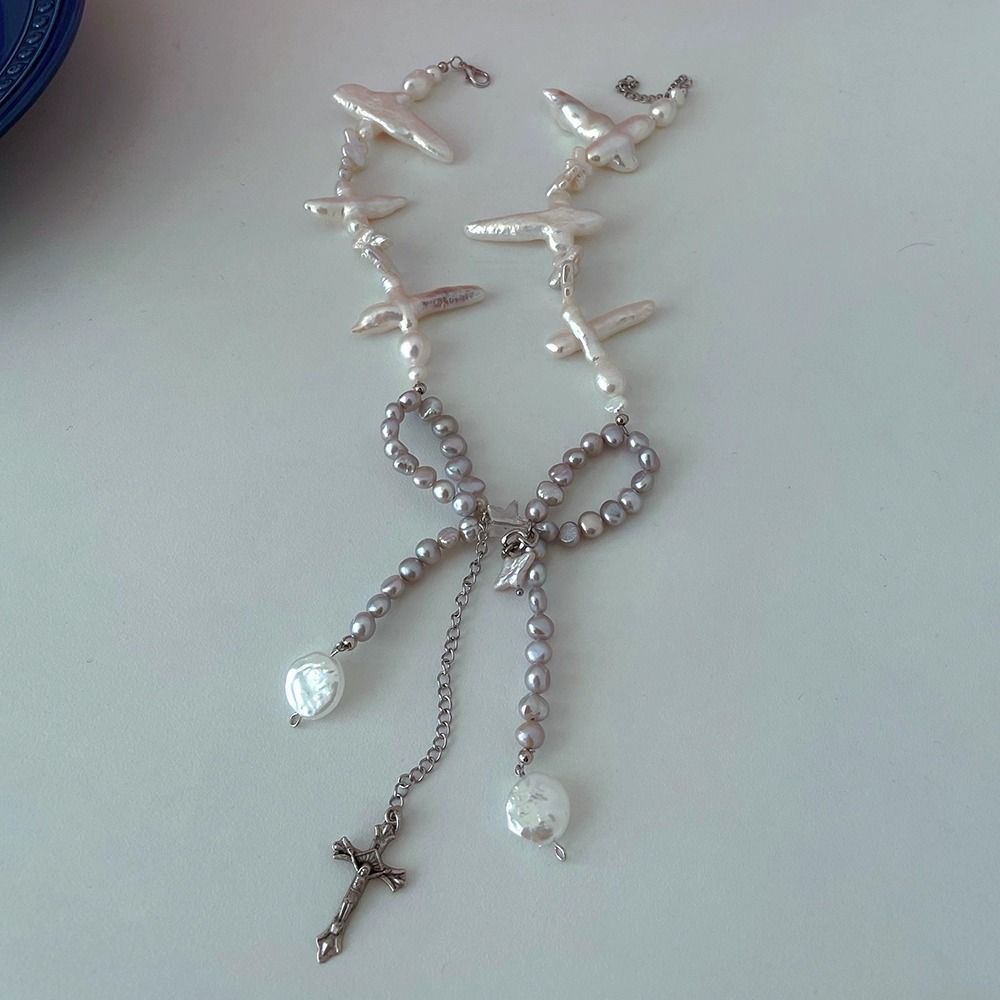 French hand-beaded silver baroque pearl bow cross pendant necklace