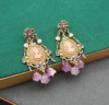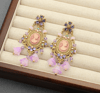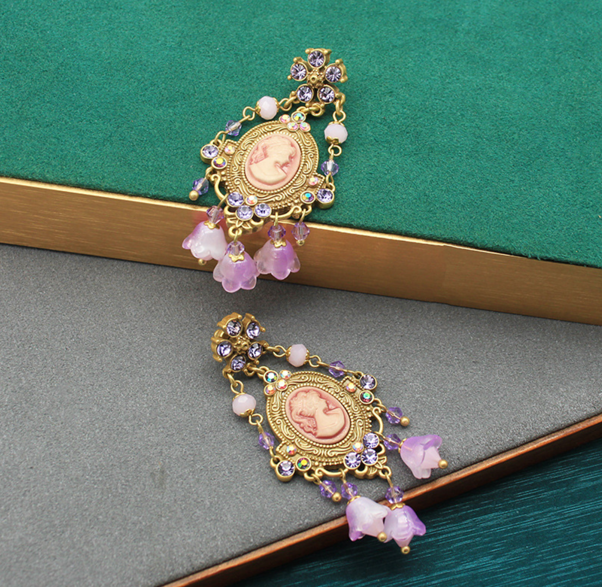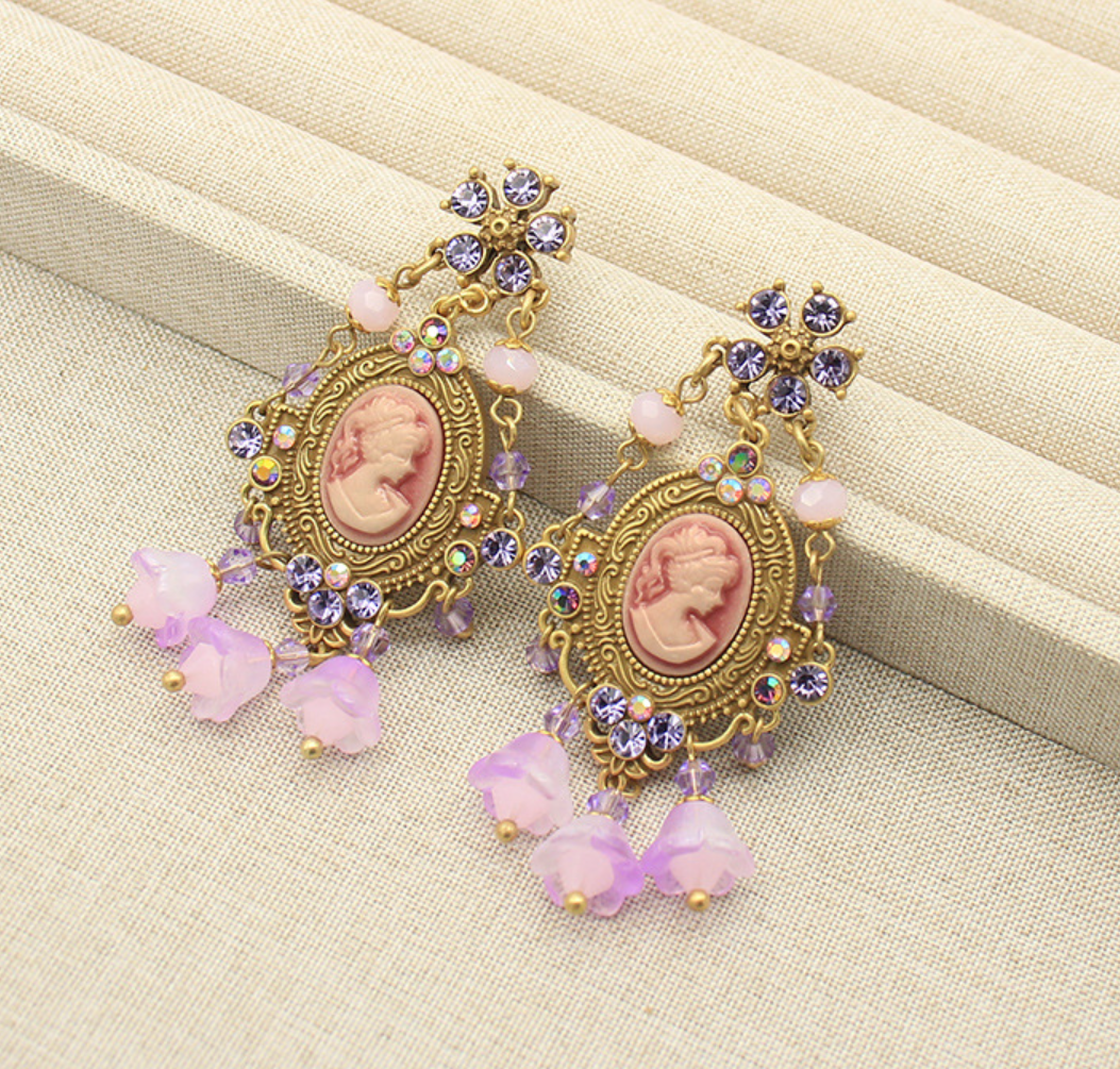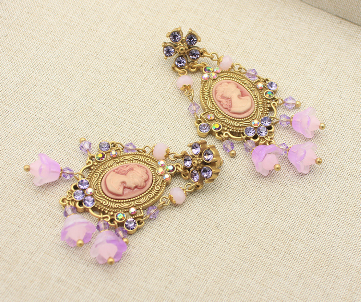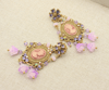 Vintage French Victorian court pink rhinestone flower portrait tassel earrings