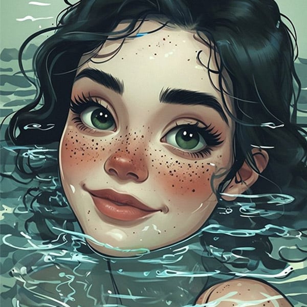 Dive into a dreamy escape with this enchanting cartoon-style portrait! 🌊✨ Featuring soft freckles, glowing green eyes, and flowing water detail, this artwork captures the beauty of serenity and self-expression. Perfect for art lovers, illustrators, or anyone who loves a touch of whimsy and glow.
