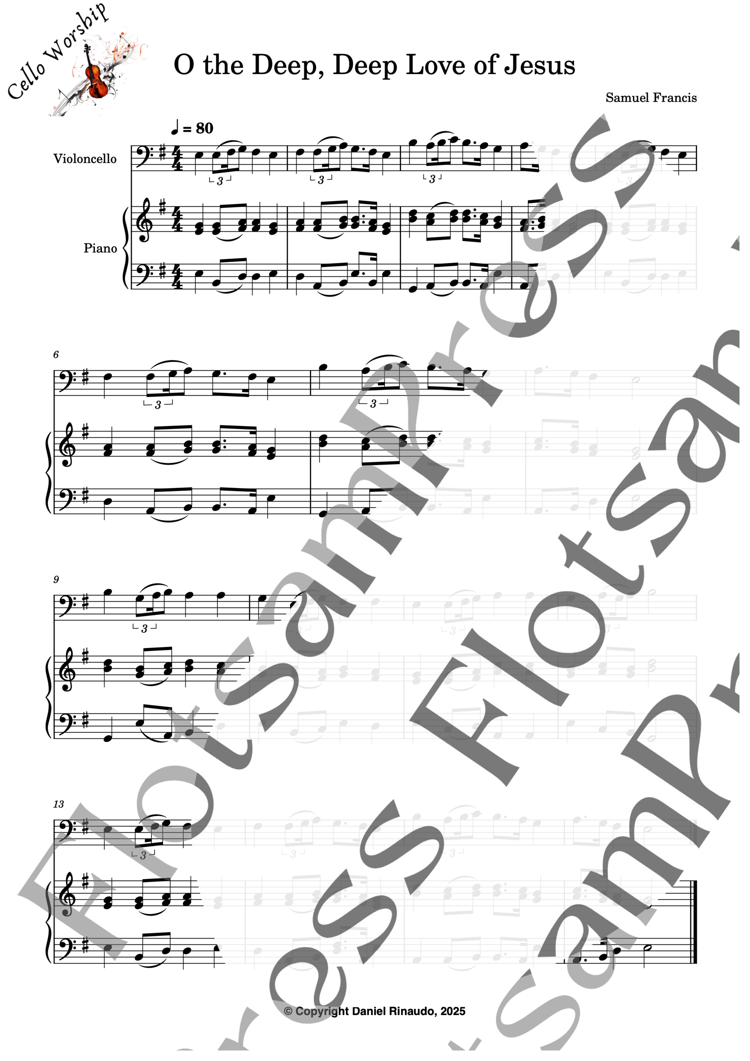 This arrangement of O the Deep, Deep Love of Jesus is written for beginner to lower-intermediate cello players, with a simple and supportive piano accompaniment. Perfect for church services, lessons, or home practice.