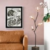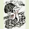This printable wall art depicts a return to paradise. It shows a couple returning to the home that they had long ago fled in fear. The sun is no longer a ball of destructive fire but a source of warmth and nourishment. This iconic scene, symbolically portrayed with linear outlines, shows a man and a woman reaching out in hope to a better future.