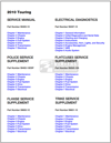 This Service Manual covers all 2010 Touring Models. This manual has the same structure as the printed version. It is bookmarked, linked and comes with hi-res wiring diagrams. The manual contains step by step instructions, and easy to read illustrations. Basically it covers everything from basic fluid changing instructions to rebuilding the motor.