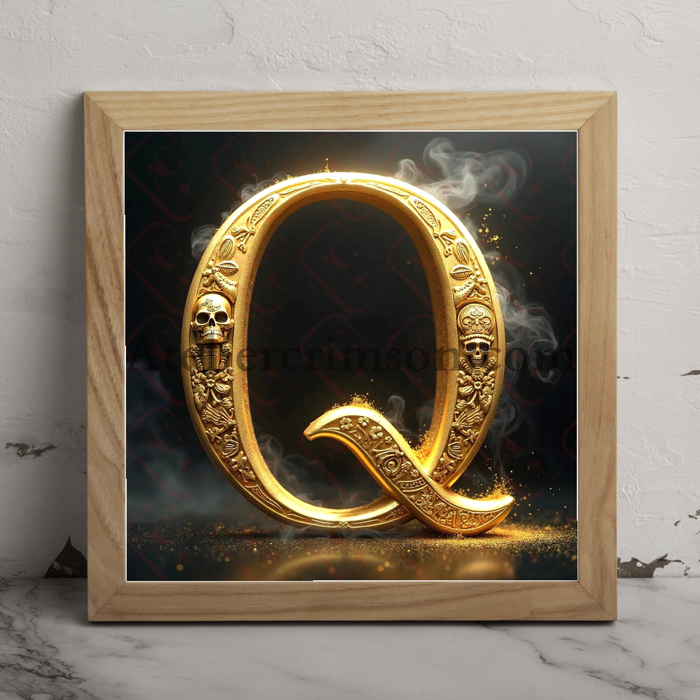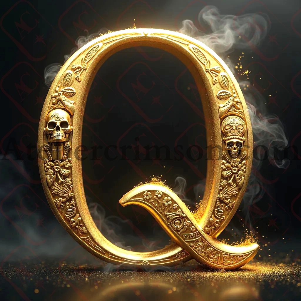 The letter Q gold maya skull Skull-inspired engravings, hyper-realistic rendering. Mystical atmosphere with subtle smoke effects. Perfect for high-end typography and design projects. GoldTypography LuxuryDesign SkullArt"