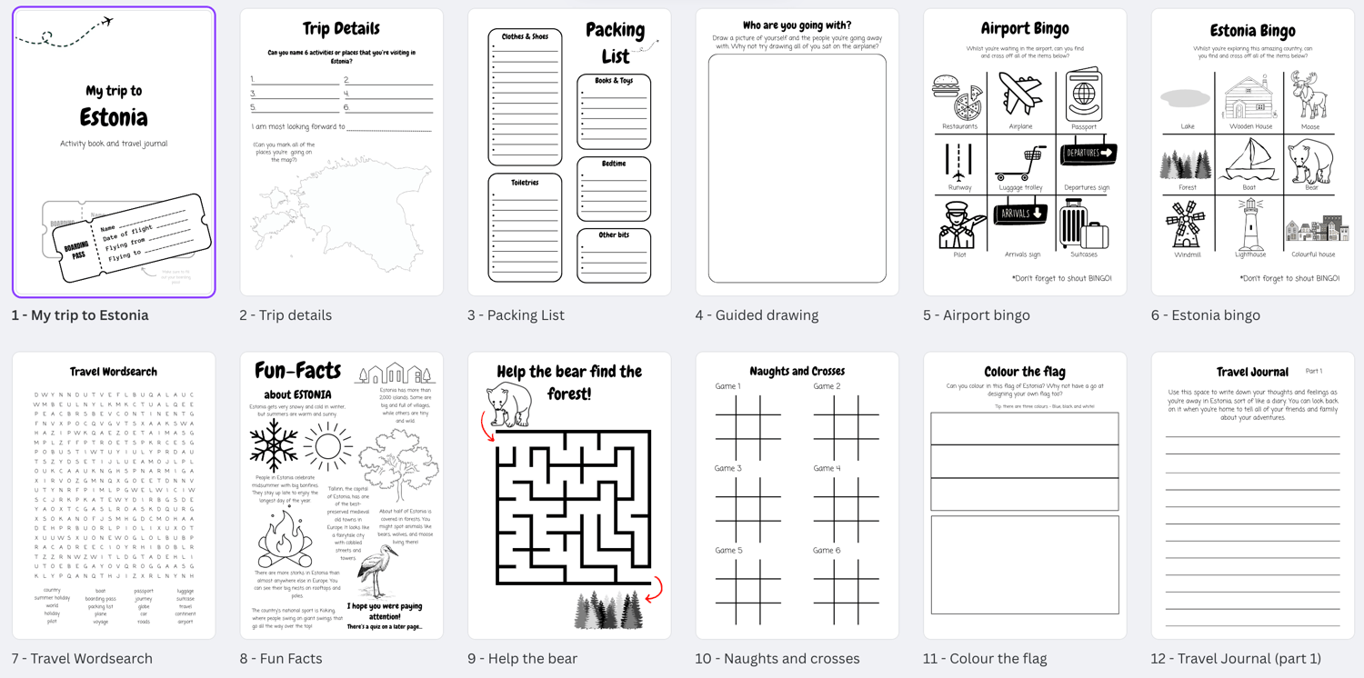"My Trip to Estonia" isn’t just for fun – it’s packed with helpful tools too! There’s space to fill out their own itinerary, a kid-friendly packing checklist, flight-friendly games, and even airport bingo – helping children feel prepared, excited, and involved in the journey.