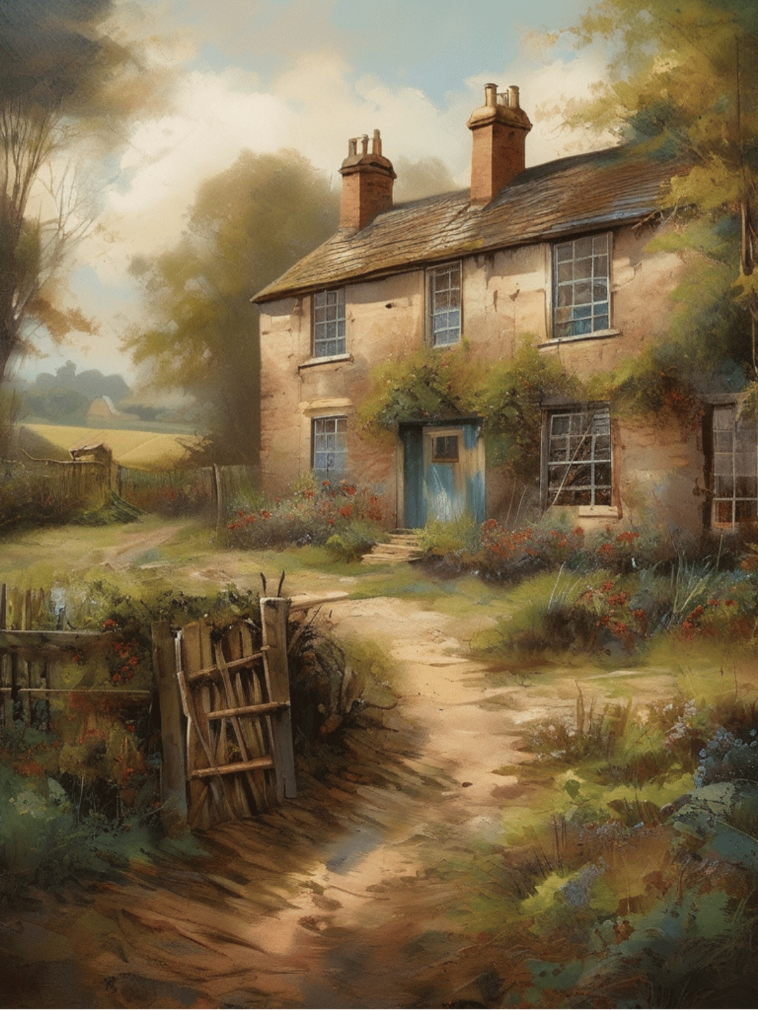 The old British countryside, a work of wall art dating back to 1960, with all its details and colours. The farm is an old oil painting in faded oil colours.png