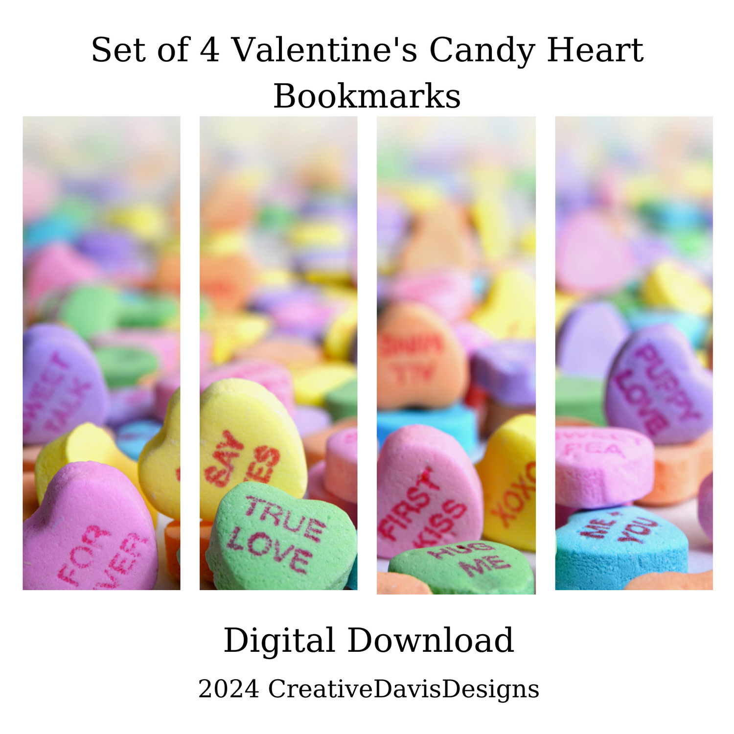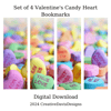 Download this set of 4 pretty Valentine's Day candy heart bookmarks for you or someone you know who loves to read.