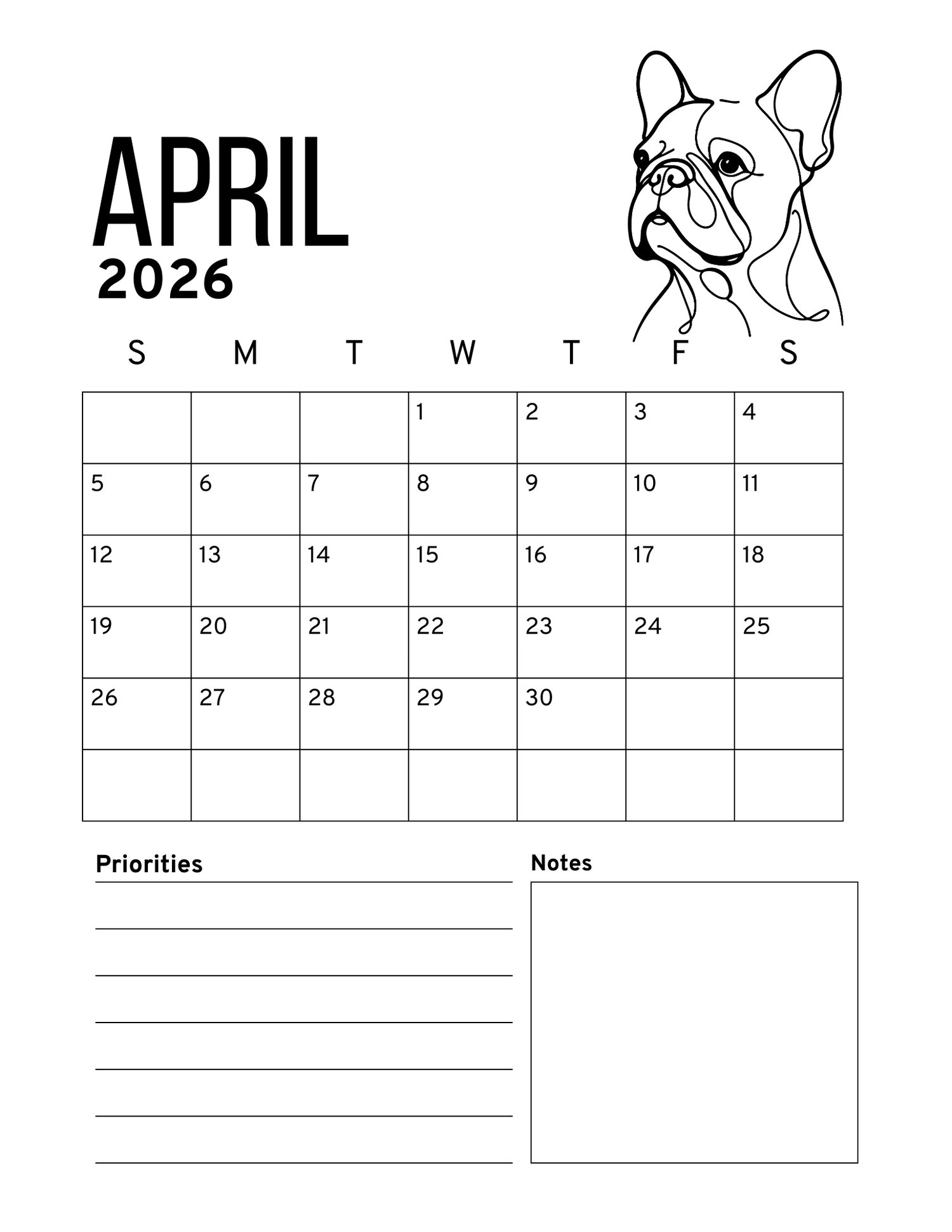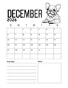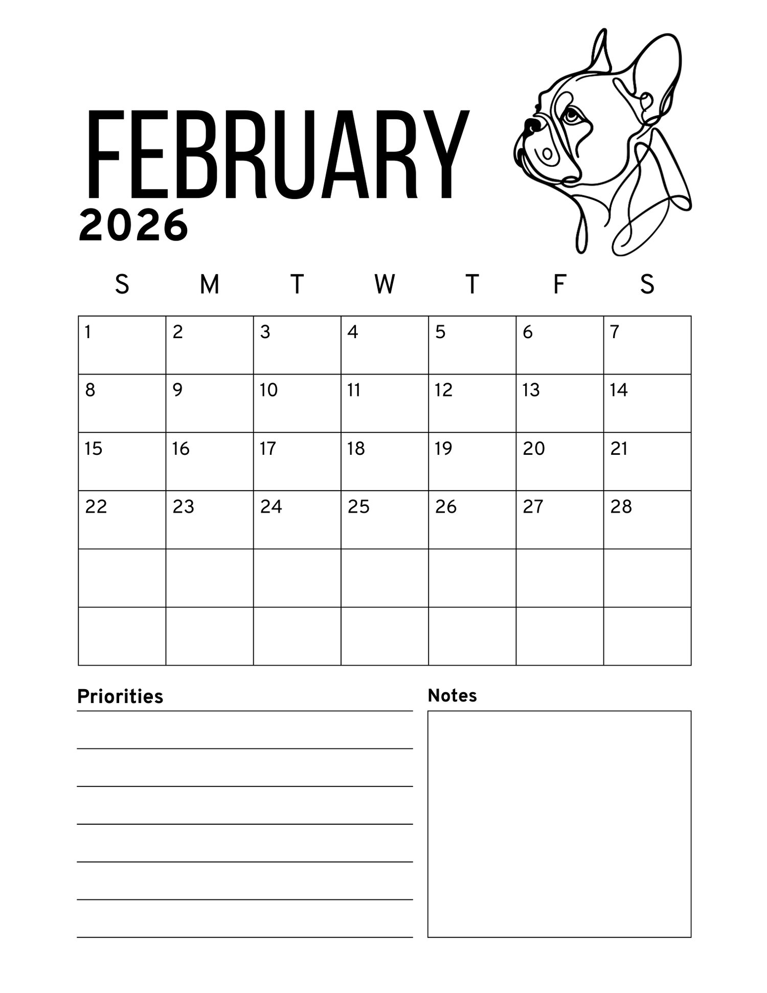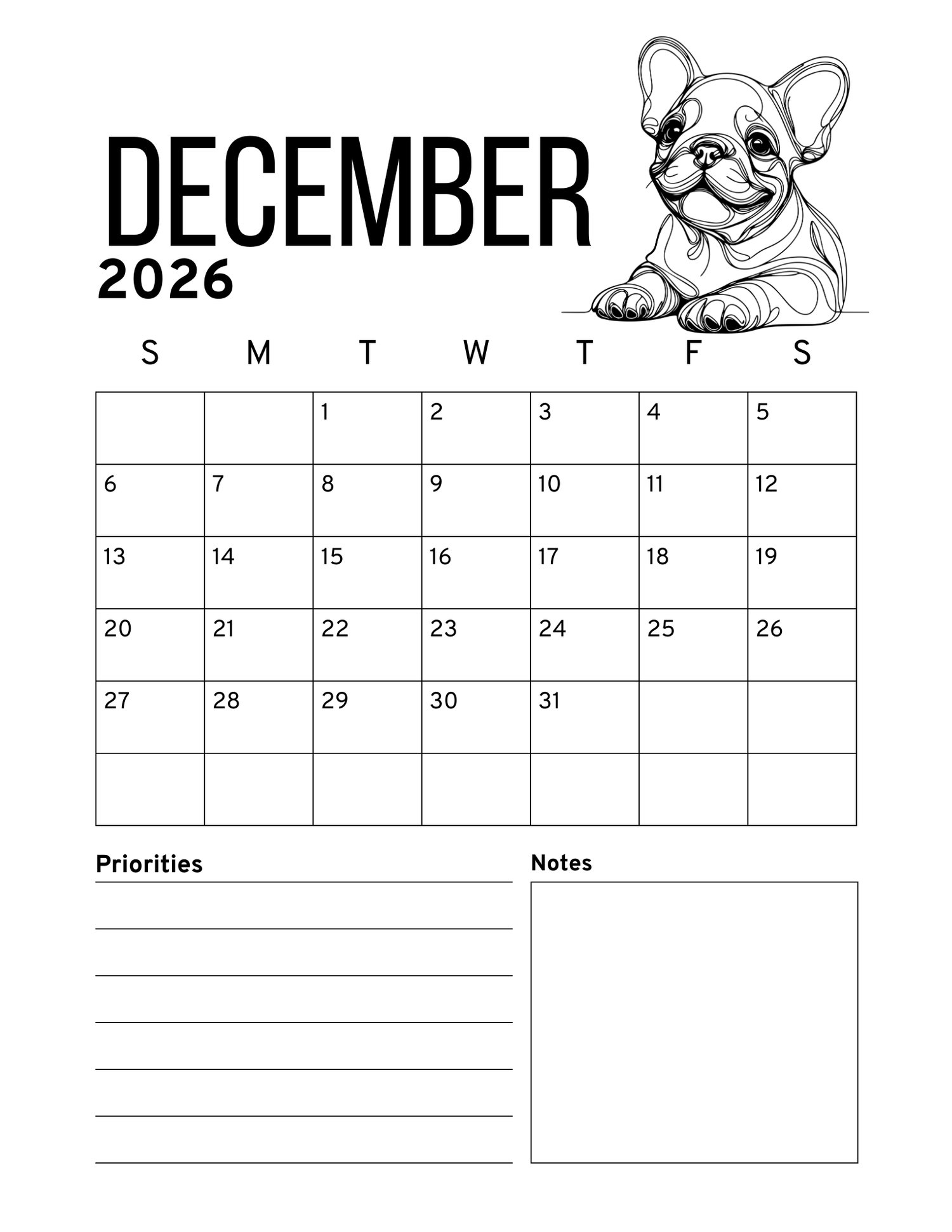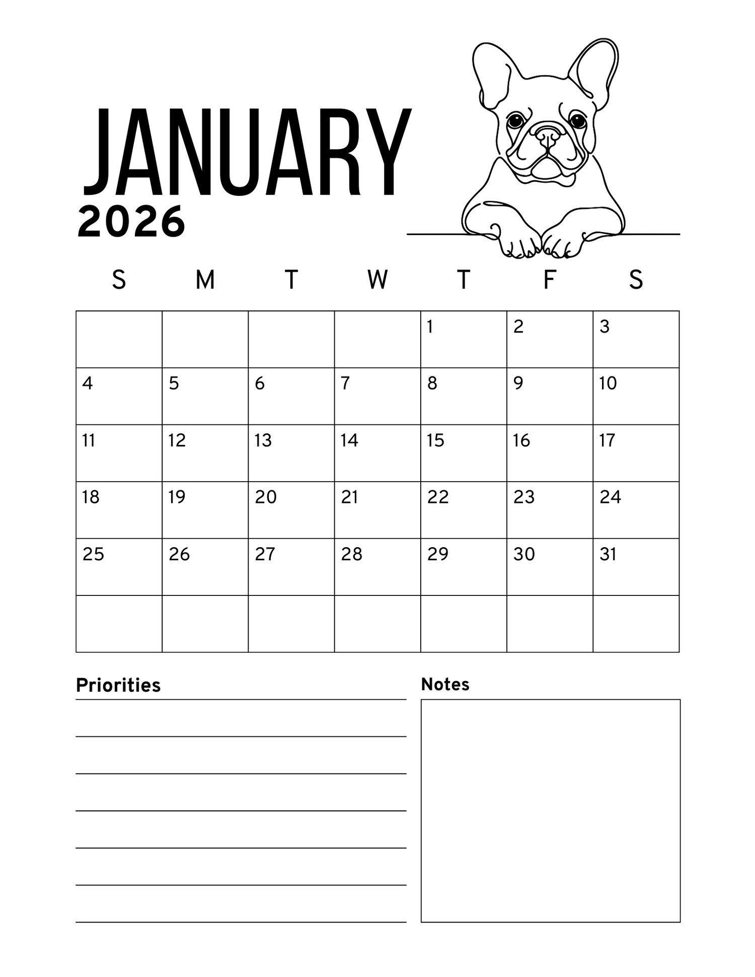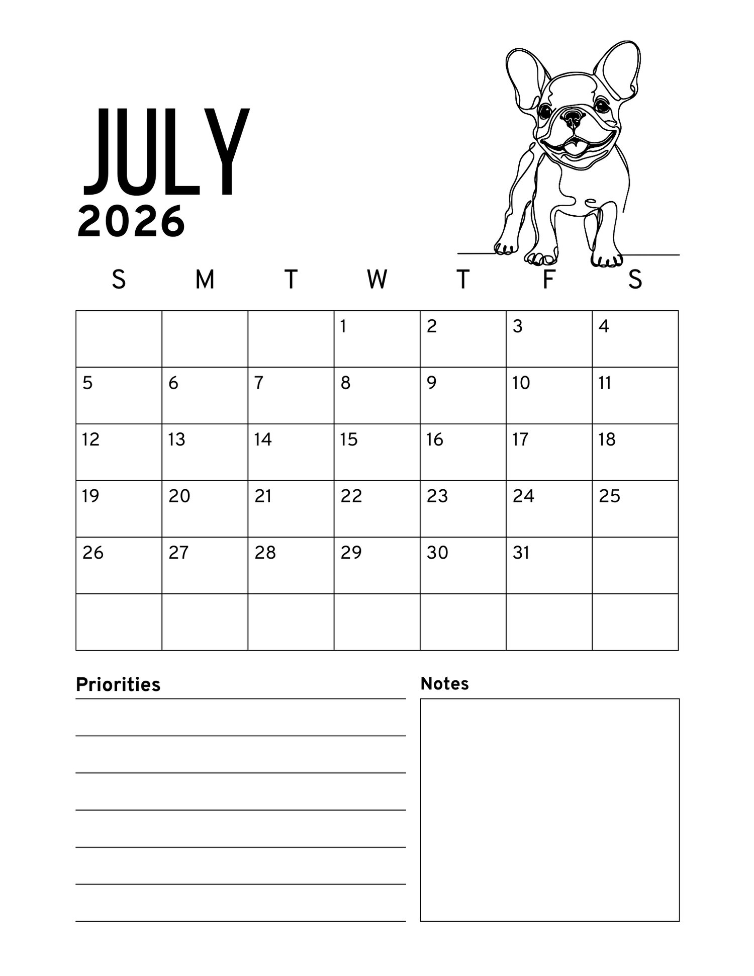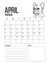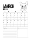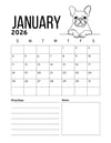 2026 FRENCH BULLDOG PRINTABLE CALENDAR