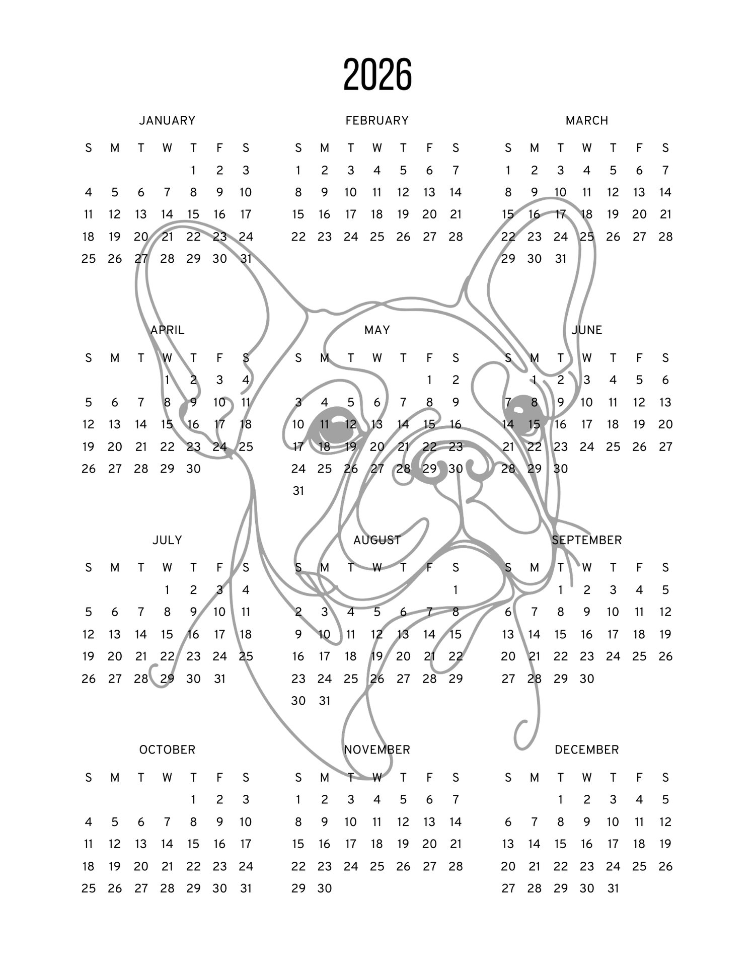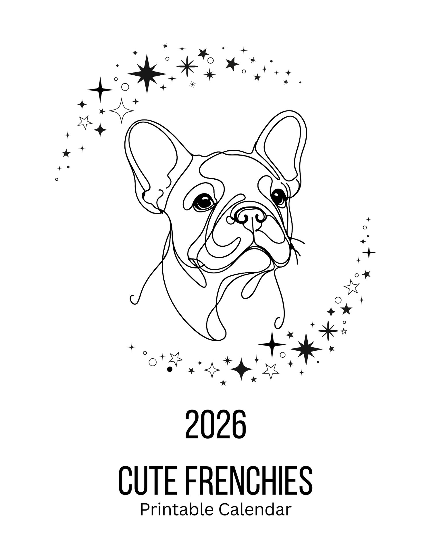Start the new year with the grace, beauty, and personality of the Frenchie! This 2026 printable calendar brings the beloved French Bulldog breed to life month after month. Enjoy stunning Frenchie-themed artwork throughout the year, or gift it to a friend who adores this loyal and elegant breed. Simply download, print, and enjoy a full year of Frenchie joy.