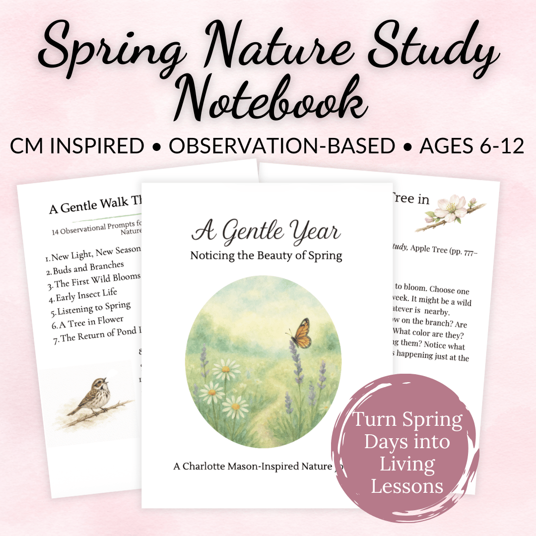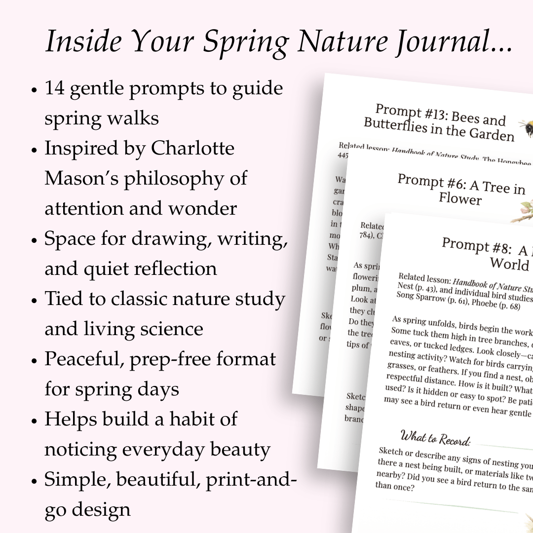 The prompts are loosely inspired by themes from The Handbook of Nature Study by Anna Botsford Comstock, making it easy to enjoy living lessons during your spring walks—whether or not you use the book itself.