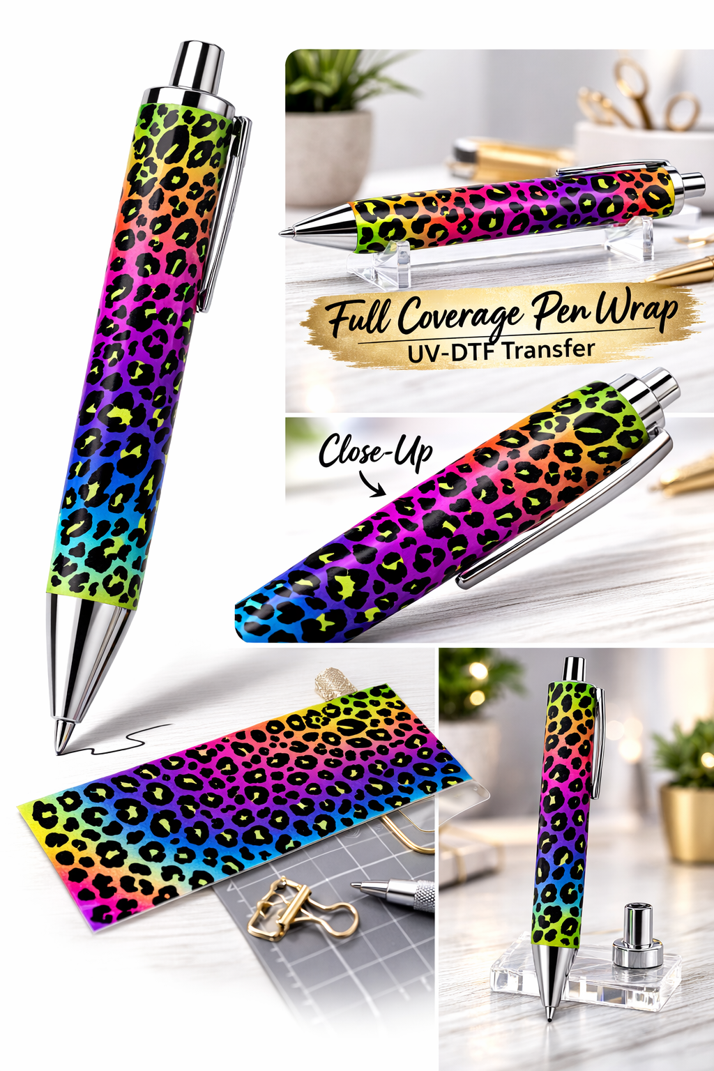 This design features a smooth gradient blend of neon green, yellow, pink, purple, and blue layered with classic black leopard print for a vibrant, high-impact look.