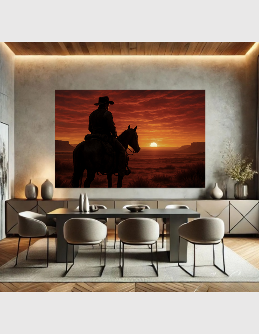 Elevate your space with this stunning Cowboy Silhouette at Sunset Wall Art PNG Digital Download, perfect for adding a touch of rugged western decor to your home or office. This high-resolution 300 DPI printable poster captures a lone horseback rider against a dramatic red sky sunset in a vast desert landscape, evoking the timeless spirit of the Wild West. Ideal for country western enthusiasts, this vintage cowboy art piece features intricate details like rolling clouds, distant mesas, and subtle brush textures, making it a standout choice for rustic wall decor or farmhouse style interiors.