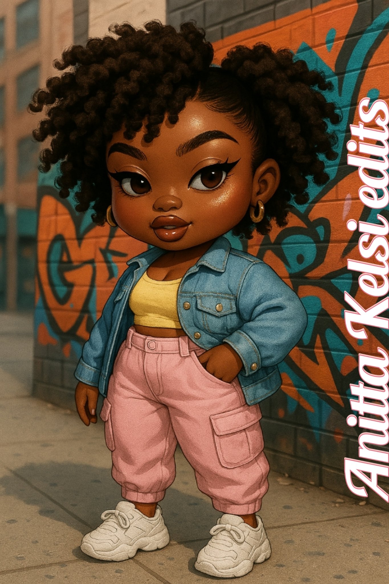 This bold and fashionable chibi is bringing full-on city flair! Styled in a light blue denim jacket, yellow crop top, pink cargo pants, and crisp white sneakers, she’s the definition of playful confidence. Her voluminous curls and vibrant graffiti background add an extra layer of attitude and artistry.