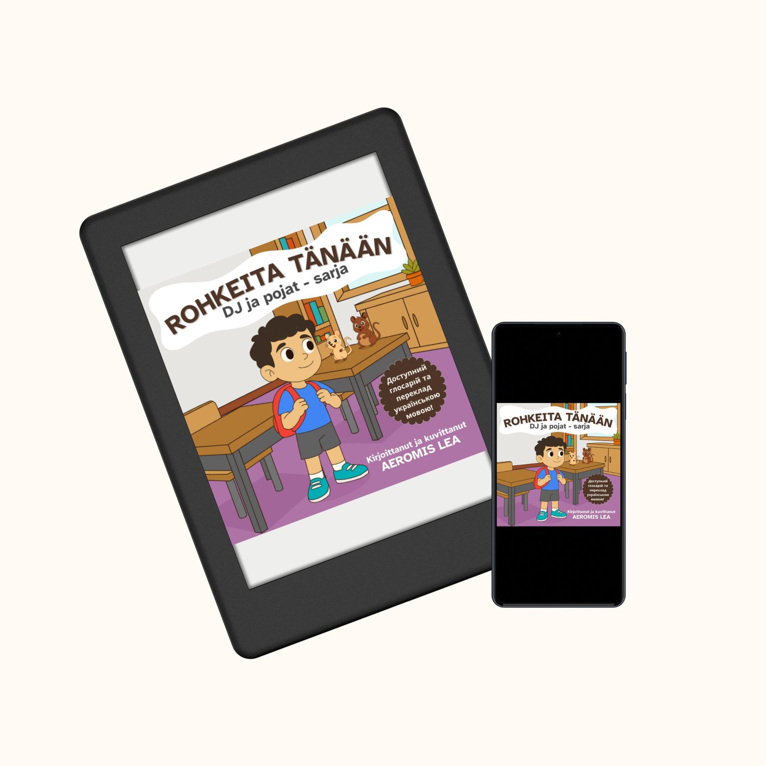 Written in easy-to-read Finnish with built-in noun and verb glossaries and a full Ukrainian translation, this gentle story follows DJ and his gerbil sidekicks, Liam and Gilberto, as they face everyday moments with quiet bravery.