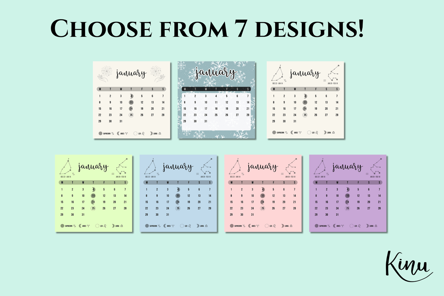 This calendar comes in two sizes: 3x3 and 4x4 inches, each in A4 and Letter formats ready to print. It also includes two versions: Monday or Sunday start.