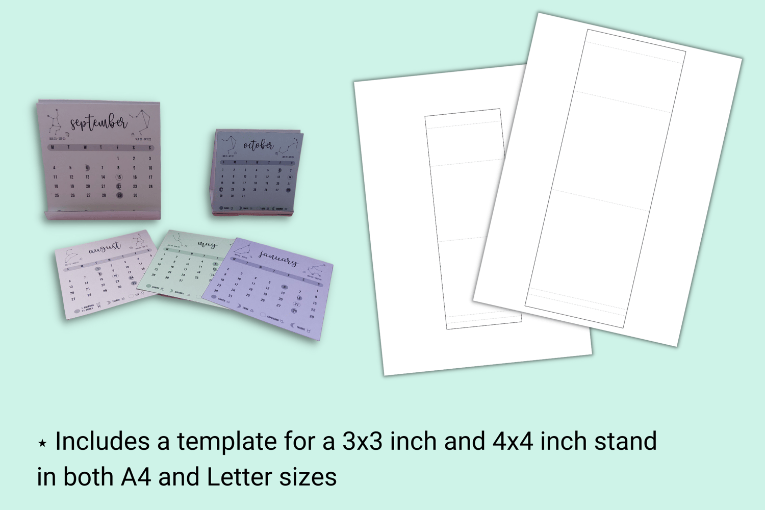 As this is a digital download, no physical product will be mailed to you. You'll receive one ZIP file containing the 2023 calendar with a folder containing the stand template in 2 different sizes: A4 (21x29.7 cm/8.3x11.7 in) and Letter US (21.6x27.9 cm/8.5x11 in). On the second folder, you’ll find the calendar in A4 and Letter, each with a Monday or Sunday start option (for each size of the calendar).