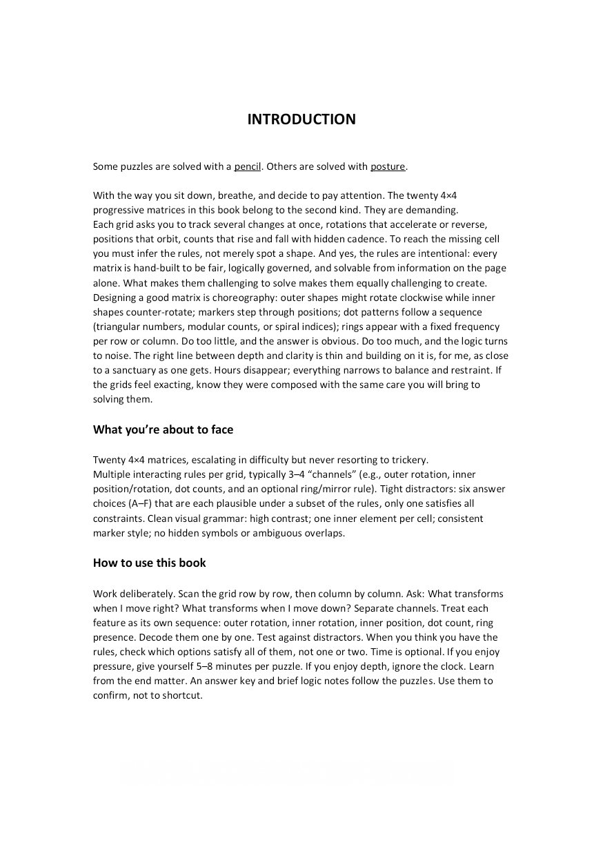 With the way you sit down, breathe, and decide to pay attention. The twenty 4×4 progressive matrices in this book belong to the second kind. They are demanding. Each grid asks you to track several changes at once, rotations that accelerate or reverse, positions that orbit, counts that rise and fall with hidden cadence. To reach the missing cell you must infer the rules, not merely spot a shape. And yes, the rules are intentional: every matrix is hand-built to be fair, logically governed, and solvable from information on the page alone. What makes them challenging to solve makes them equally challenging to create. Designing a good matrix is choreography: outer shapes might rotate clockwise while inner shapes counter-rotate; markers step through positions; dot patterns follow a sequence (triangular numbers, modular counts, or spiral indices); rings appear with a fixed frequency per row or column. Do too little, and the answer is obvious. Do too much, and the logic turns to noise. The right line between depth and clarity is thin and building on it is, for me, as close to a sanctuary as one gets. Hours disappear; everything narrows to balance and restraint. If the grids feel exacting, know they were composed with the same care you will bring to solving them.