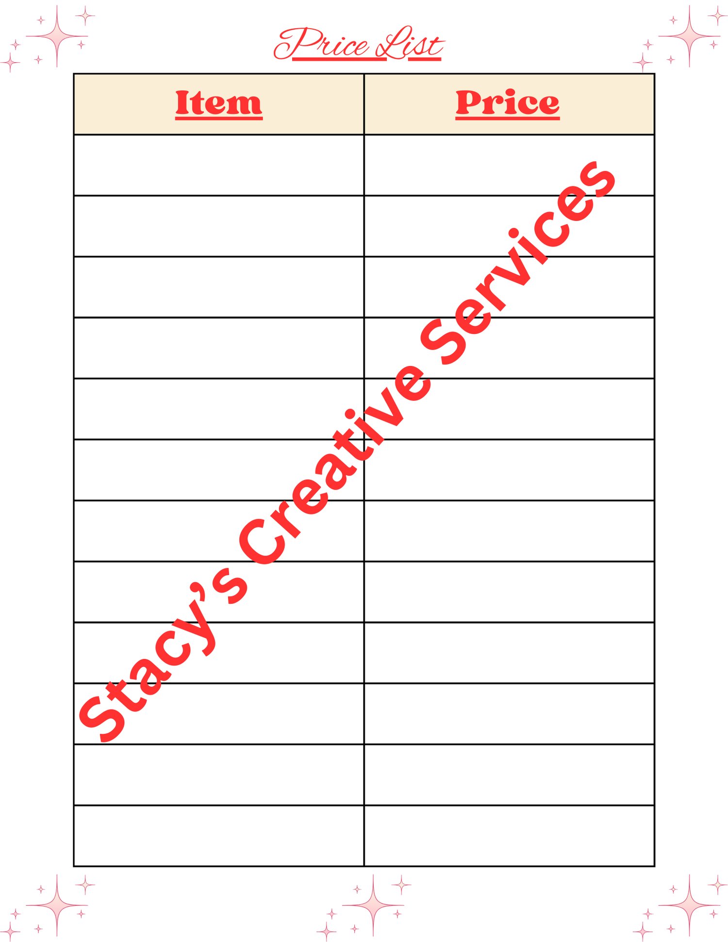 Grab an item price list to keep track of items and prices. Created by Stacy's Creative Services.
