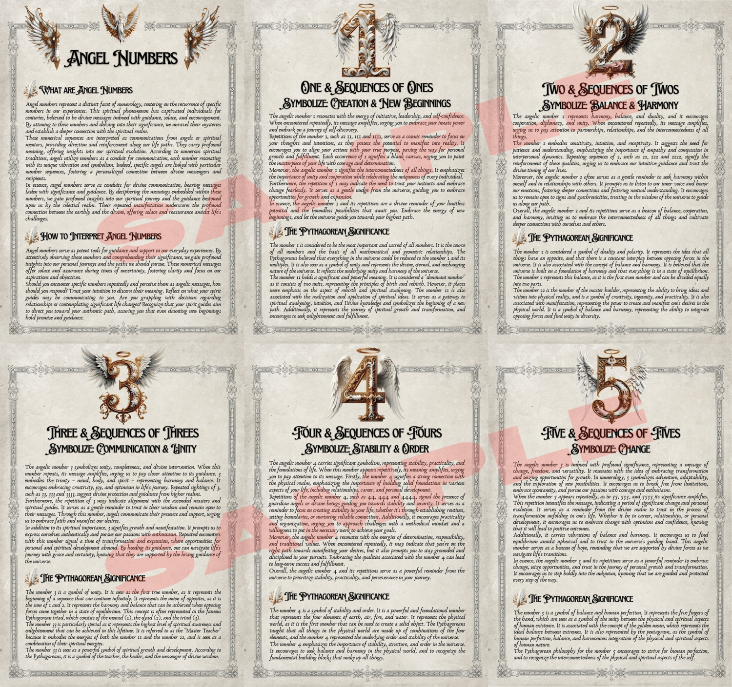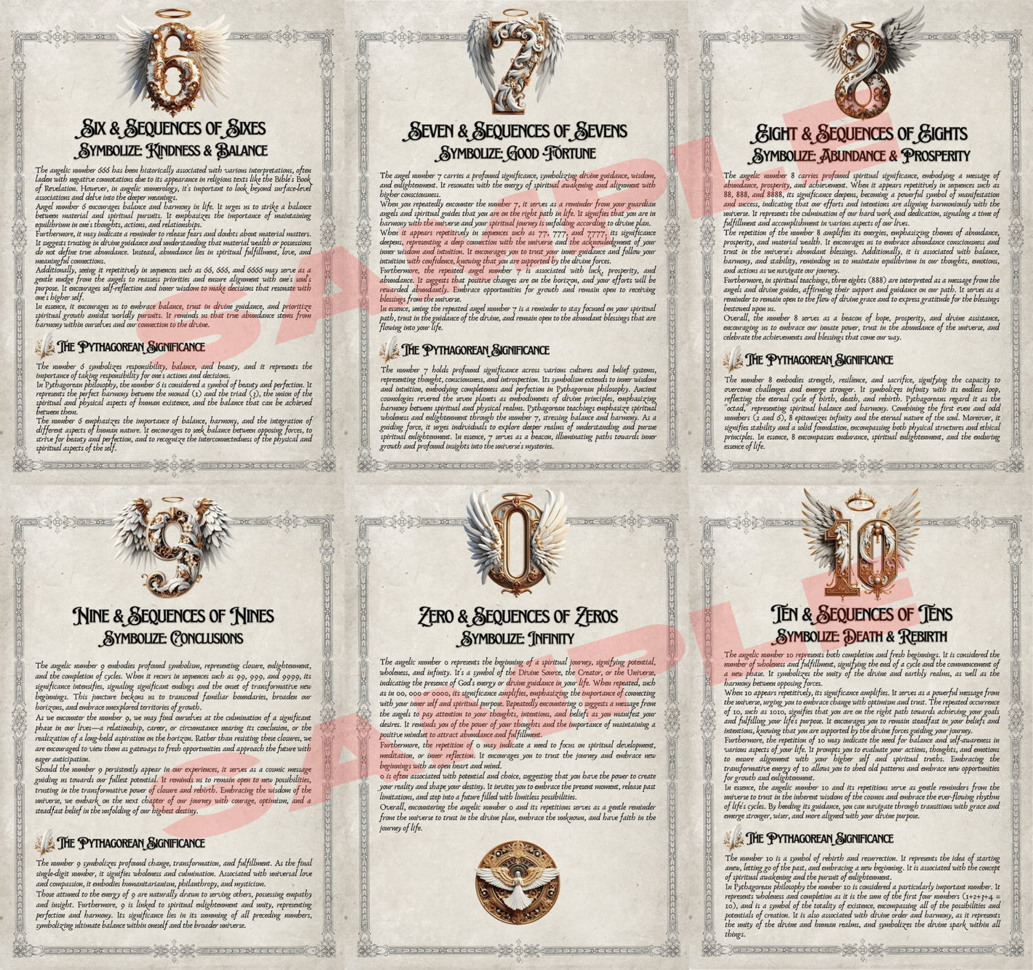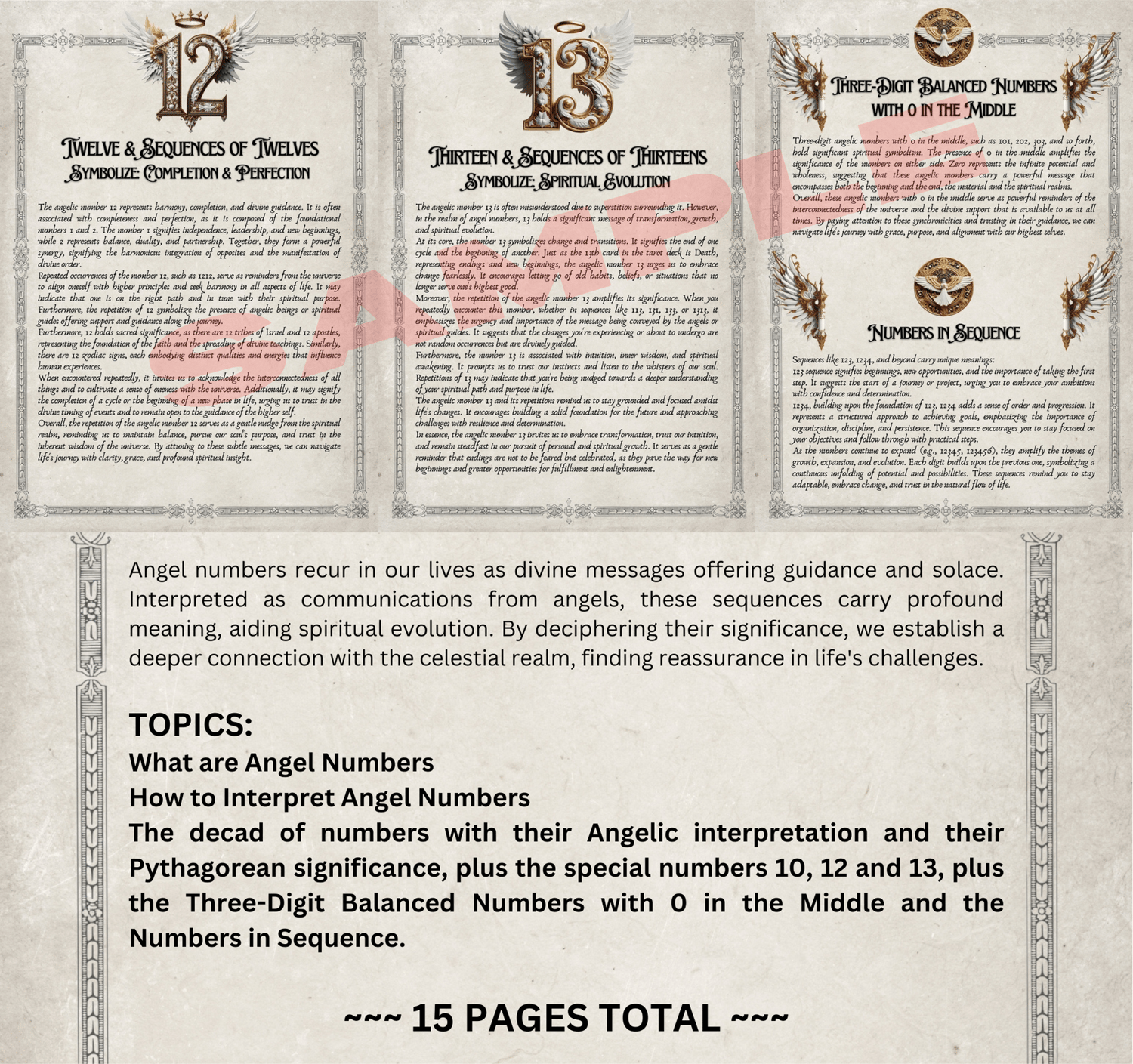The decad of numbers with their Angelic interpretation and their Pythagorean significance, plus the special numbers 10, 12 and 13, plus the Three-Digit Balanced Numbers with 0 in the Middle and the Numbers in Sequence.