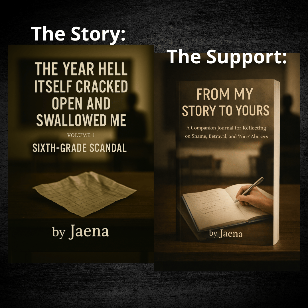 Together, they create a complete, self-paced experience for readers who want more than insight alone. The journal–workbook provides guided prompts, containers, and reflection pages that support integration without overwhelm or retraumatization.