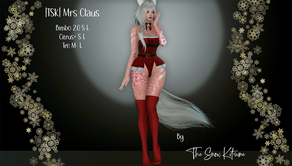Comes with toggles to remove the skirt and the small bow on the stockings. The outfit likely looks better in darker colours but the velvet look is made using the asset's texture.