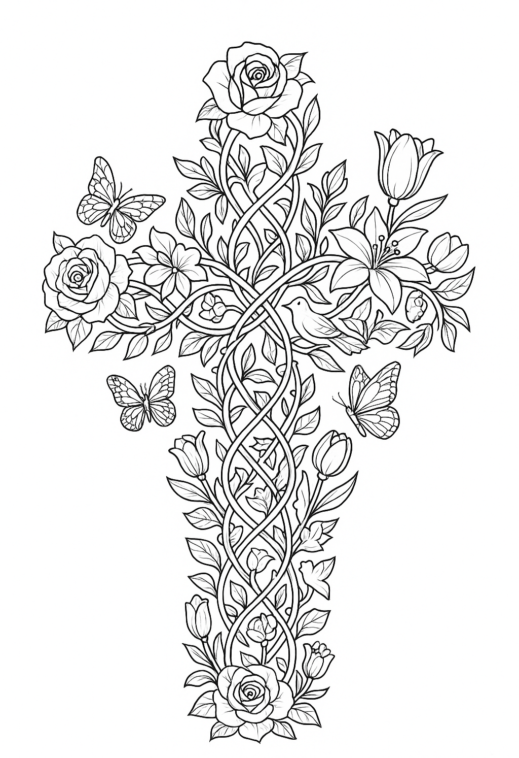 - Intricate vine-style cross with roses, tulips, and butterflies