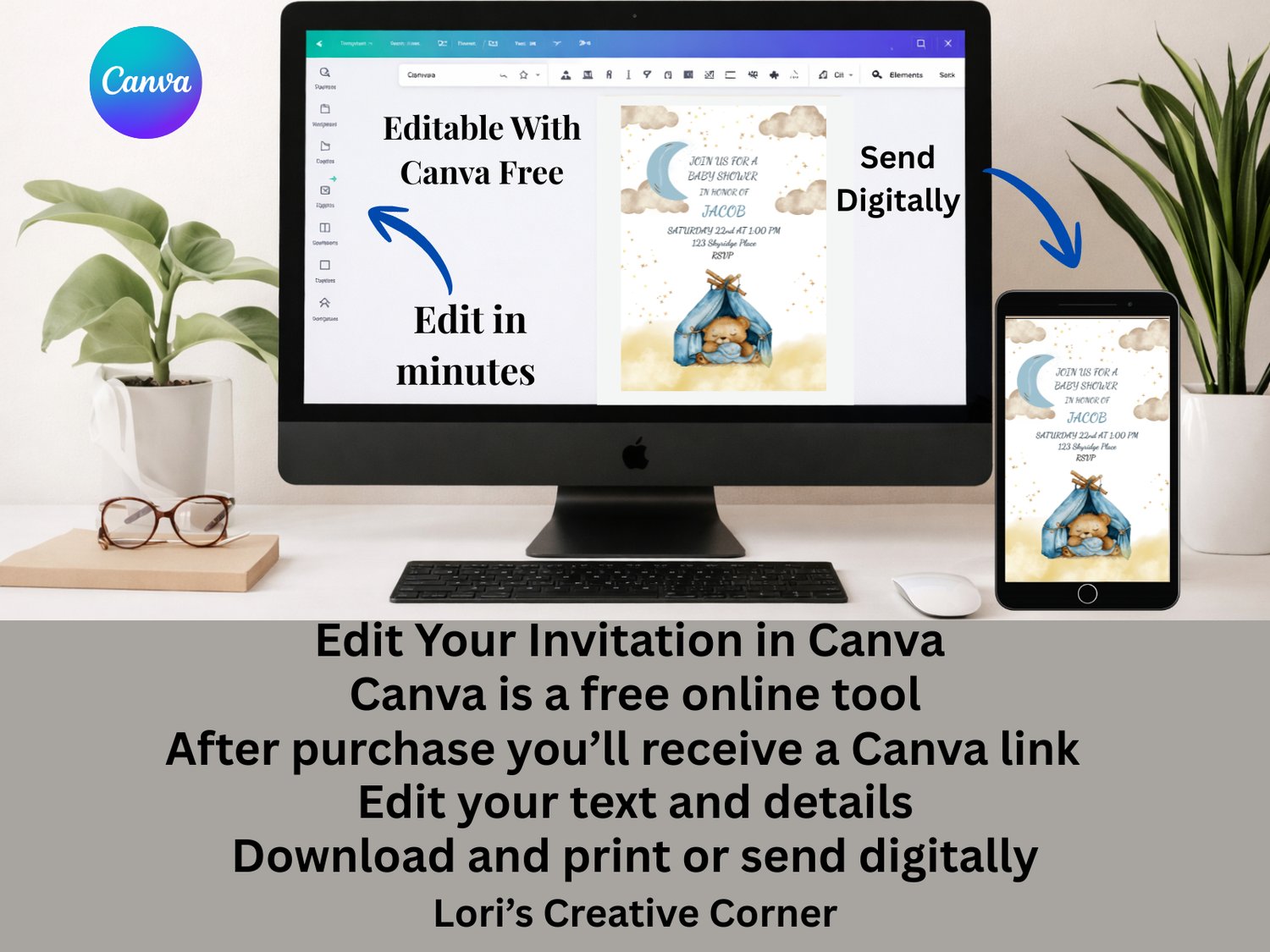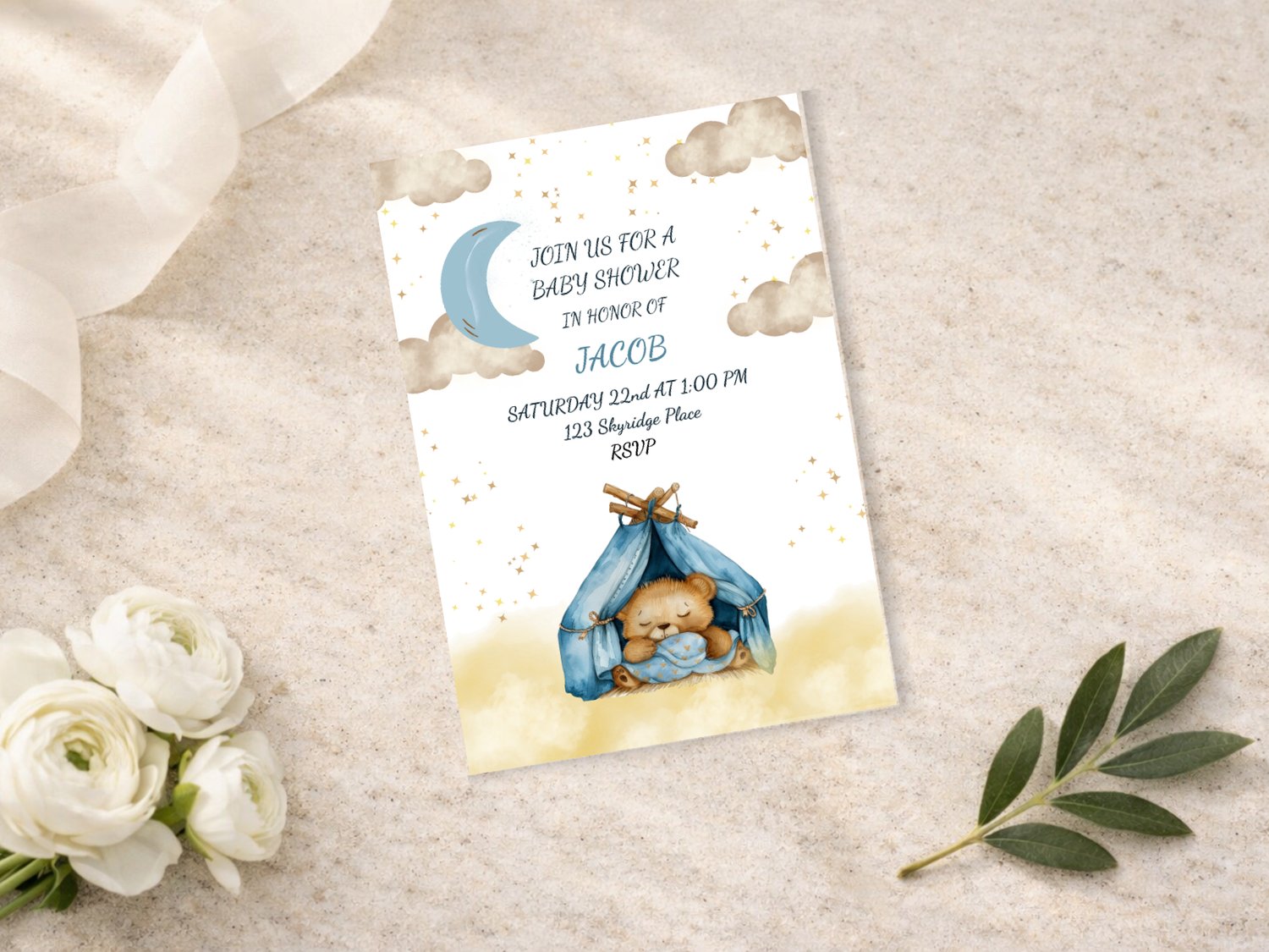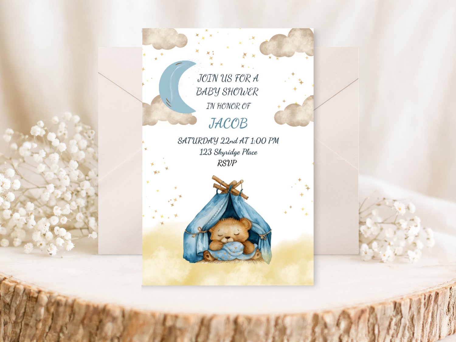 Welcome your little one with a sweet touch of magic! This adorable editable baby shower invitation features a cozy bear snuggled inside a tent, surrounded by dreamy clouds, a glowing moon, and twinkling stars. Itβs the perfect way to invite friends and family to celebrate a special day filled with love and joy.
