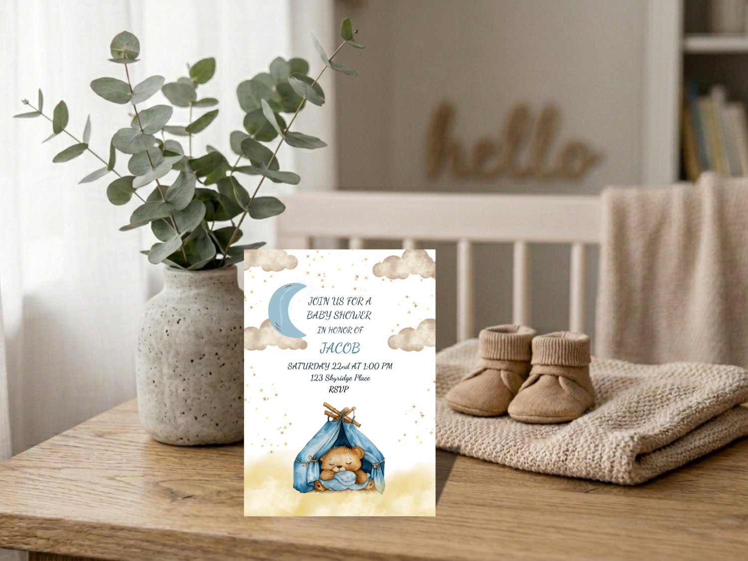Editable Baby Shower Invitation β Bear in Tent with Moon & Stars