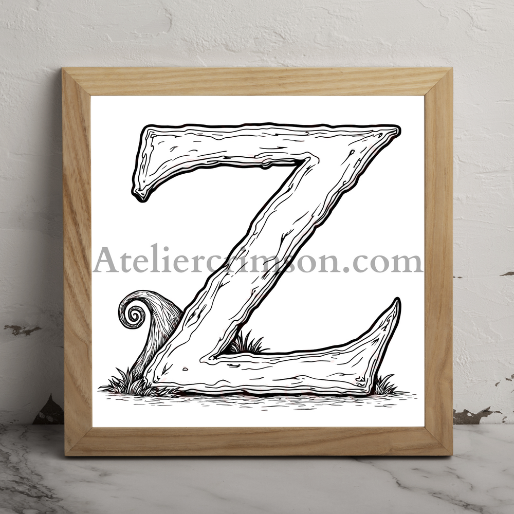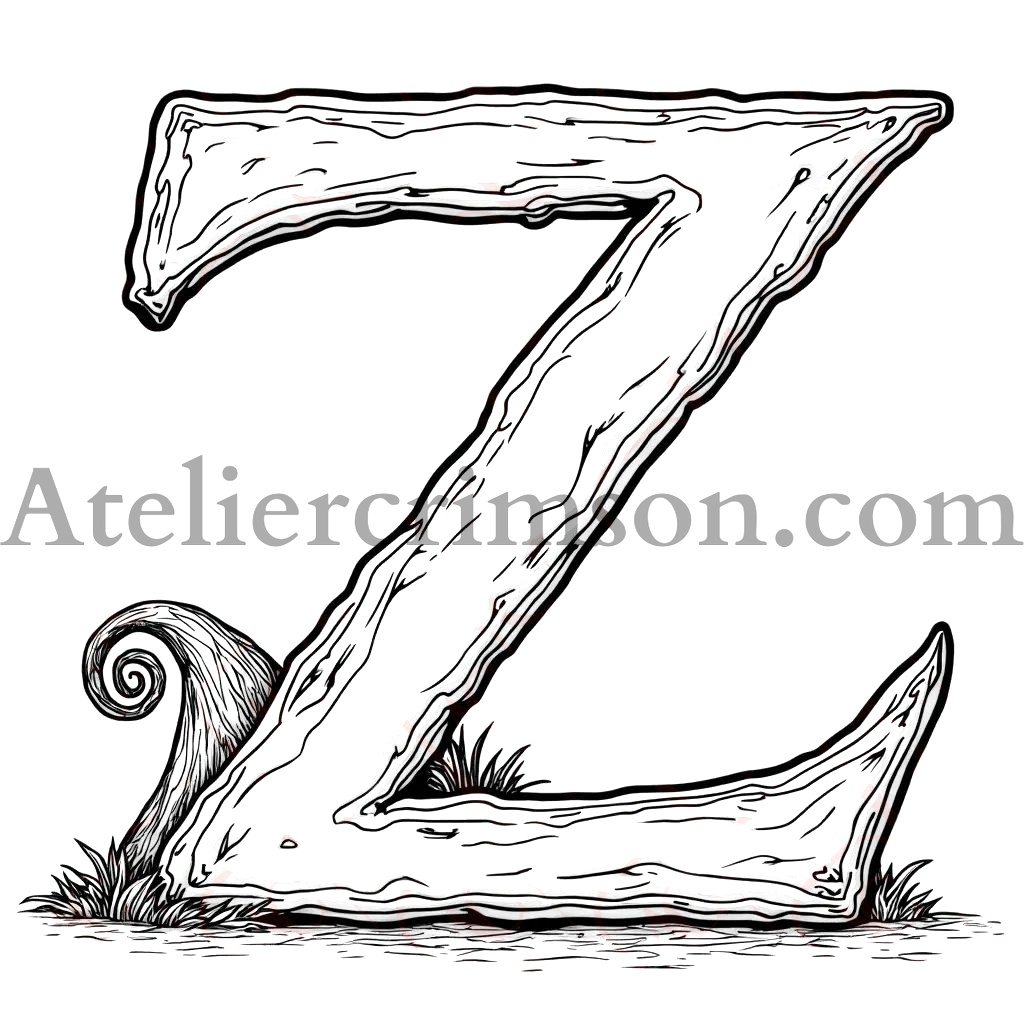 The letter Z colloring book jack halloween Tim Burton-inspired alphabet art. Spooky-cute character in coloring book style. Perfect for Halloween crafts or gothic decor.