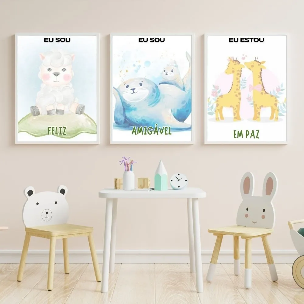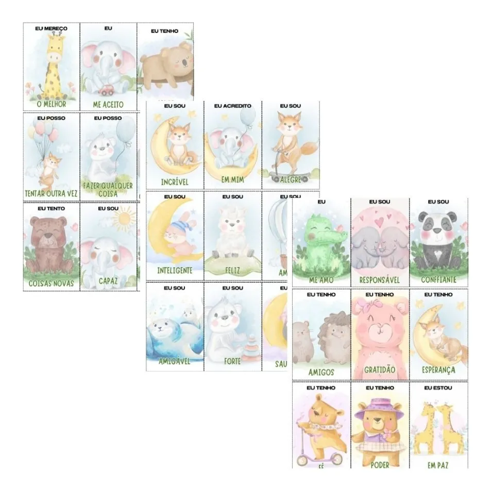 Cartões de afirmação para crianças, com desenhos de animais aquarelados.