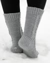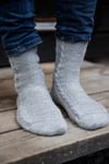 Juhani's socks are knit from the toe up with a stockinette toe, reinforced heel flap, and twisted-rib cuff. These elegantly modest cabled socks come in three sizes, fit for teens, women, and men alike.