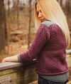 This pullover has a saddle shoulder construction that begins with knitting the two saddles that cover the shoulders. Stitches are picked up from their long edges to create the yoke. Front and back are joined at the underam and the body is knit in the round. Seamless set-in sleeves are picked up around the armholes, shaped with short rows and then knit in the round to the cuffs.
