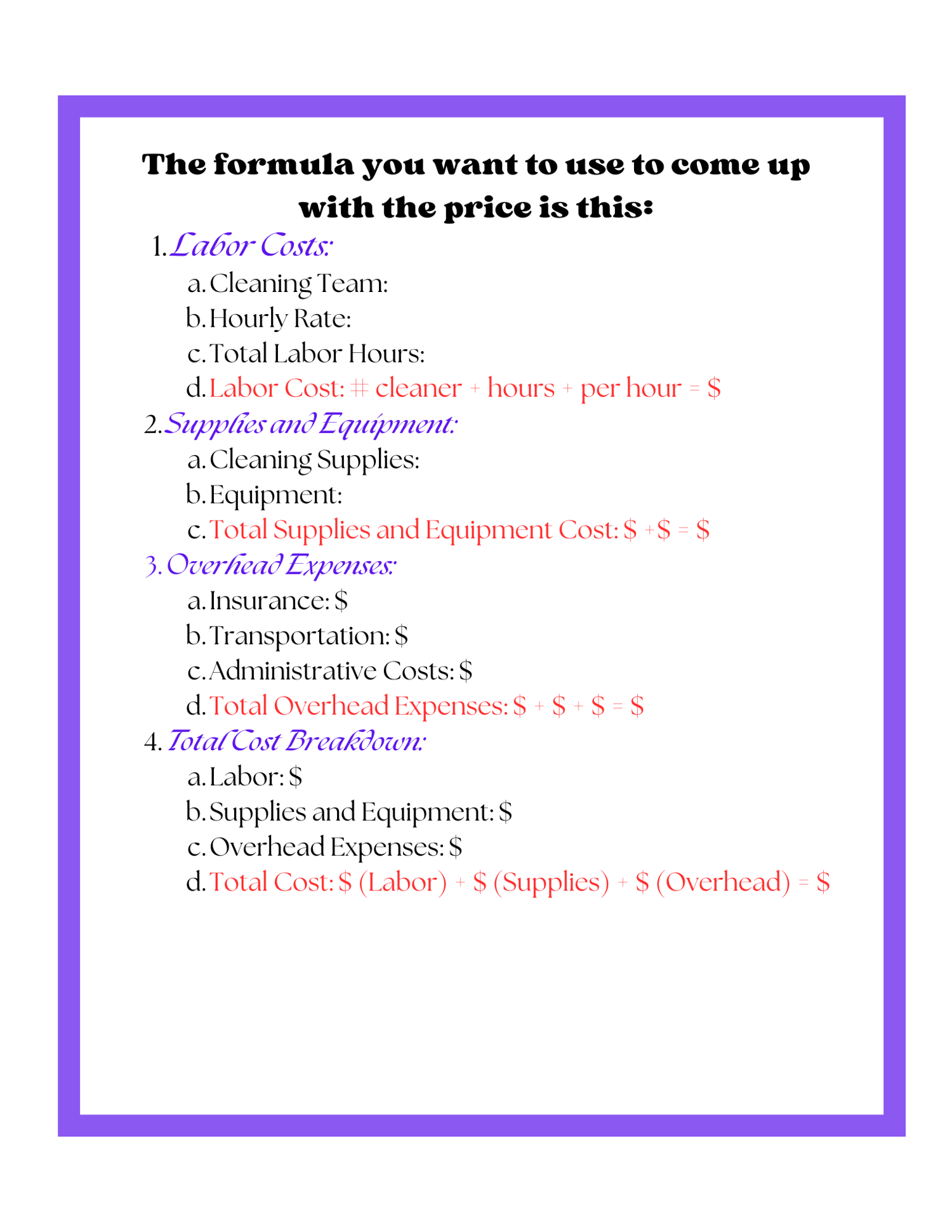 - Understand Your Costs: Learn how to break down and analyze your labor, supplies, and overhead costs.