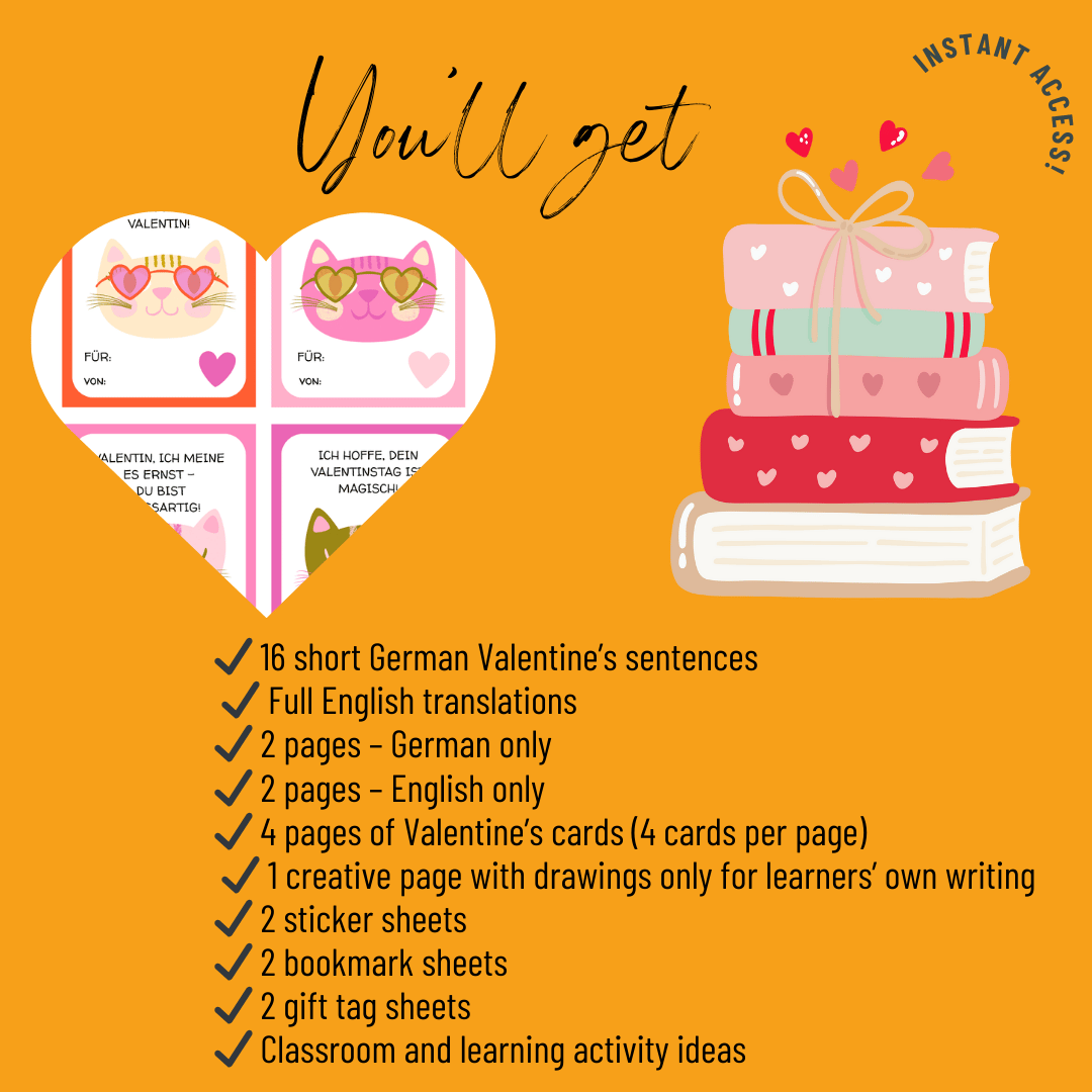 This printable Valentine’s pack helps children enjoy simple German sentences in a fun, stress-free way.