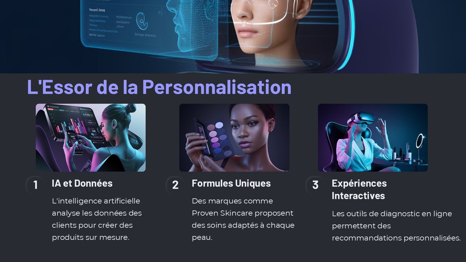 → Personnalisation par IA, essayage virtuel via réalité augmentée, et innovations biotechnologiques révolutionnant les soins de la peau, les cosmétiques et le bien-être.