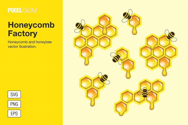 This illustration set comes complete with multiple variations of honeycomb layouts for you to work with. You can even create your own! Using the Adobe Illustrator software, easily rearrange, subtract or add honeycombs to build your own honeycomb layout.
