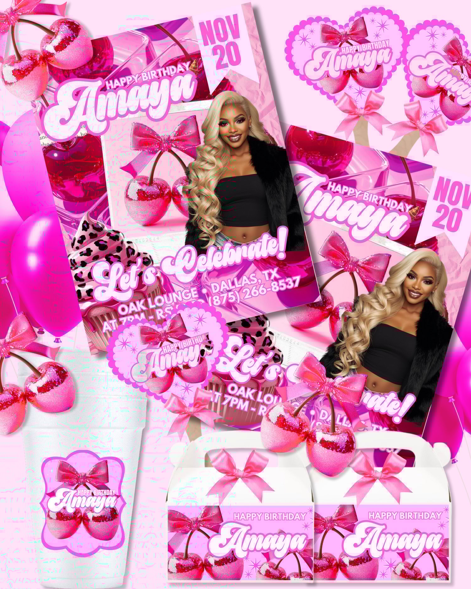 Say hello to the cutest party set ever. The Pink Cherry Birthday Bundle! 🍒💗 This fun and girly bundle includes everything you need to create an adorable, cohesive birthday celebration. Each template is fully editable in Canva Pro, giving you complete creative control over colors, text, photos, and design details.