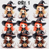 Halloween cute witches and warlocks. 2 boys, 2 girls; each has blonde, brunette and red hair and blue, brown and green eyes. Please see piccies for full details. Includes text files and bat clipart. 40 PNGs. Instant download, sublimation, print, DTF, UVDTF.