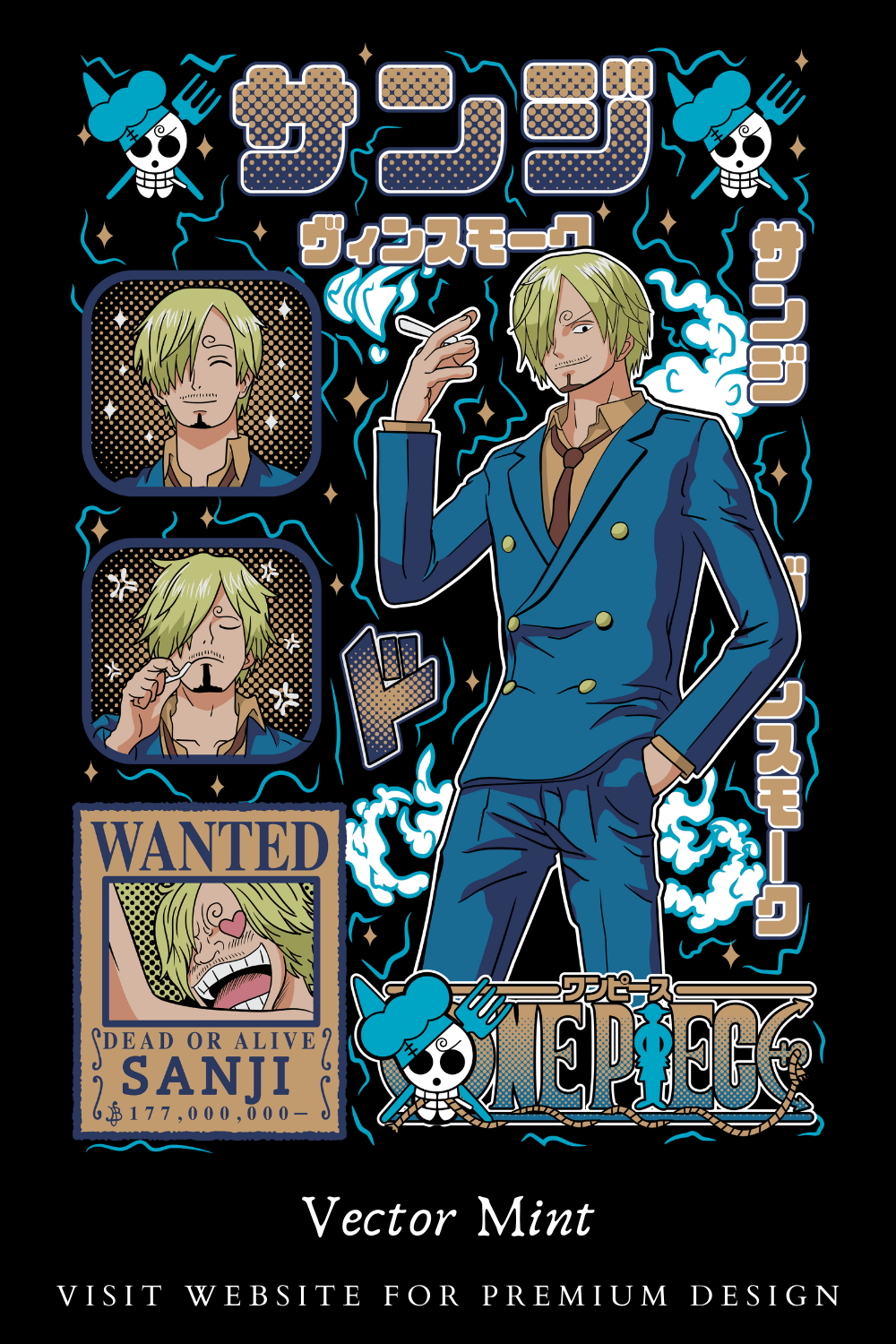 Vinsmoke Sanji Wanted Poster One Piece Anime T-Shirt Design Streetwear Graphic PNG Print Ready